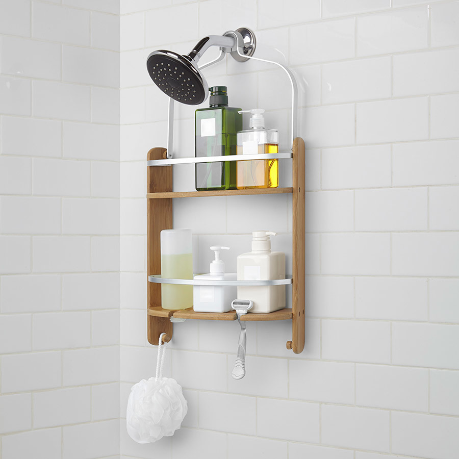 Прочная основа из бамбука удерживает большой вес, а металлический держатель со специальным силиконовым крючком , ,позволит повесить органайзер на крепление для душа или штангу для шторки в ванной.