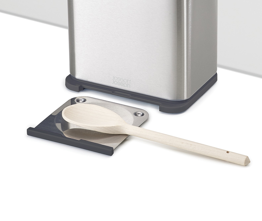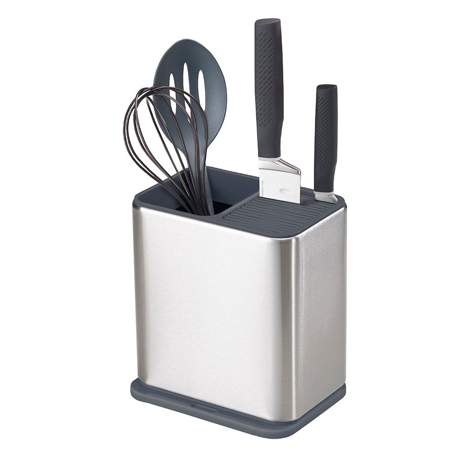 Великолепный органайзер для хранения лопаток, половников, поварских ложек, ножей и других поварских принадлежностей. Основное отделение разделено на сегменты. Это обеспечивает максимальную вместительность и компактное хранение. Отдельно предусмотрен отсек для ножей. В основание контейнера встроена съёмная подставка, на которую удобно класть грязную ложку во время приготовления пищи. Органайзер просто разбирается и легко моется. Нескользящие ножки обеспечивают хорошую устойчивость на любой поверхности.