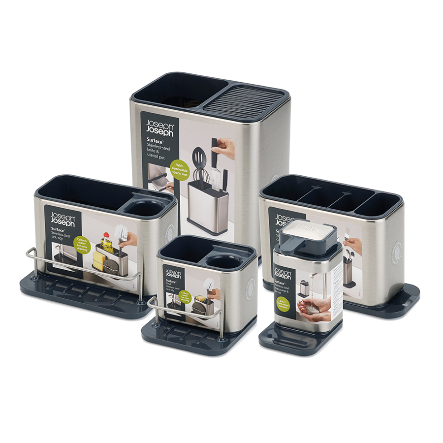 Коллекция , ,Surface — современное решение для организации рабочего пространства кухни. Все предметы коллекции изготовлены из пластика с отделкой из стали класса SS430, хорошо известной своими антикоррозийными свойствами.