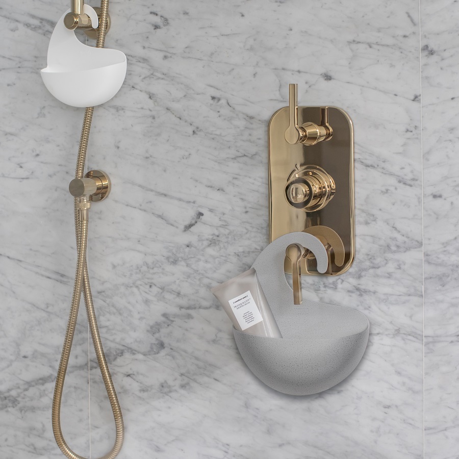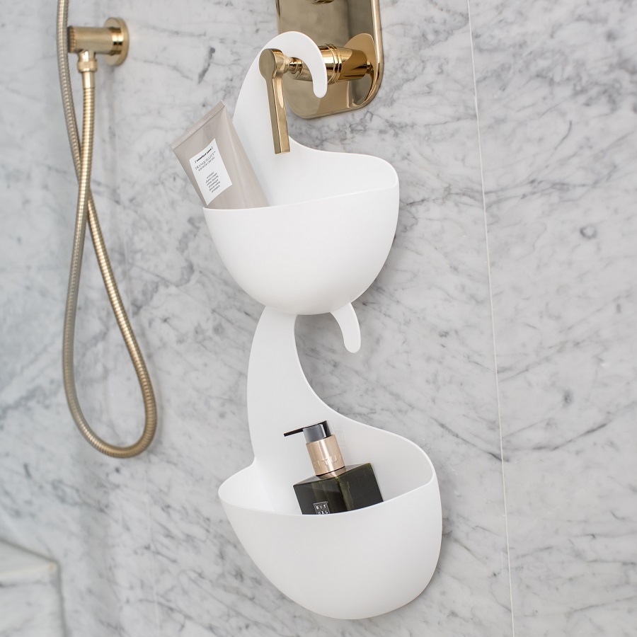 Органайзер Surf с крючком в виде волны можно повесить на стойку душа или кран. Прорези на дне выполняют несколько функций: не дают воде застаиваться и позволяют цеплять органайзеры друг за друга.