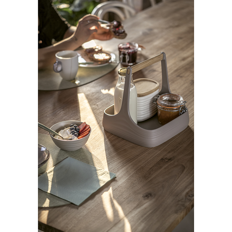 В качестве исходного сырья выступают пластиковые бутылки объемом 1,5 л. Дизайн изделия напоминает керамику. Реалистичности внешнему виду придают тщательно подобранные пастельные цвета и намеренно неровные круговые рисунки, создающие эффект ручной работы. Органайзер отлично гармонирует с другими предметами коллекции Tierra.