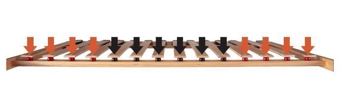 - Центральная ось с системой ERGOTEC-1 3-x дифференцированных зон жесткости, снабженная каучуковыми сферическими амортизаторами для каждой рейки, начиная с ширины подставки 100 см и более.