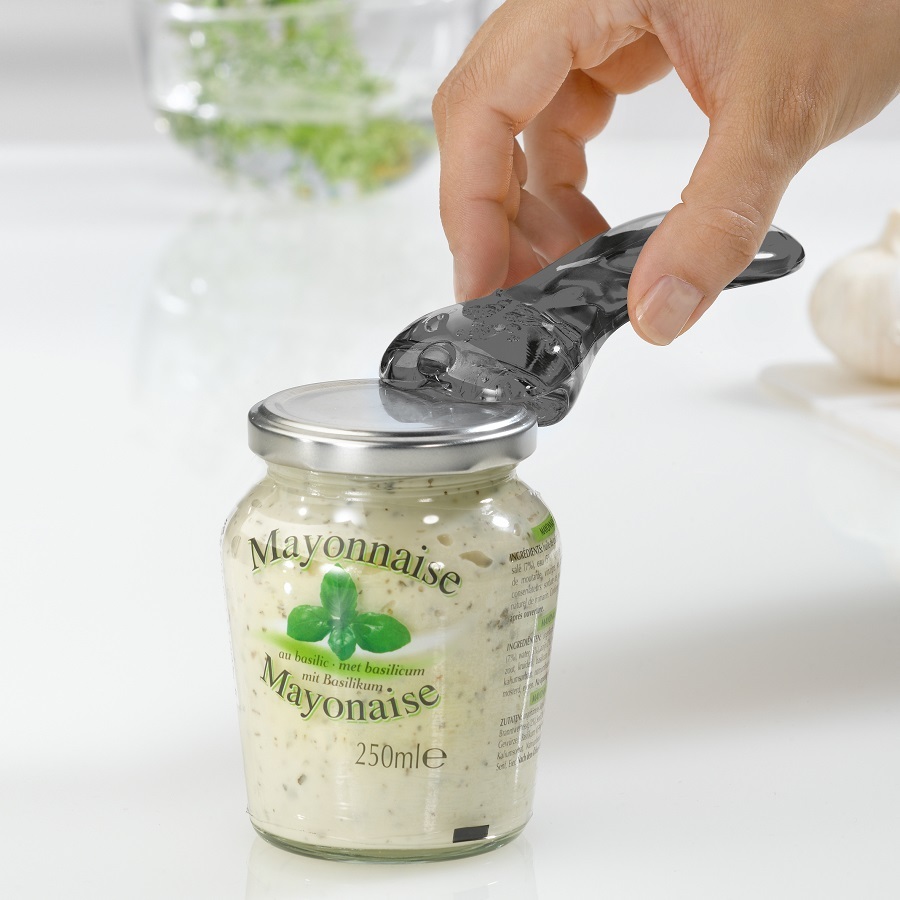 Открывашка для банок TOM без усилий и труда откроет любую консервацию. За счет специальной конструкции воздух при нажатии попадает внутрь, что и позволяет легко снять крышку.