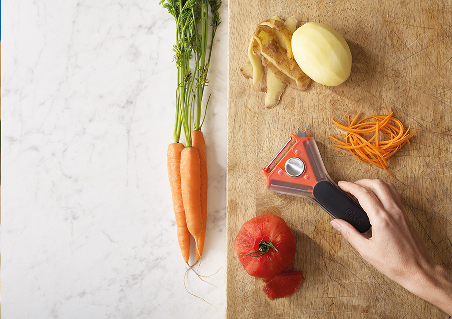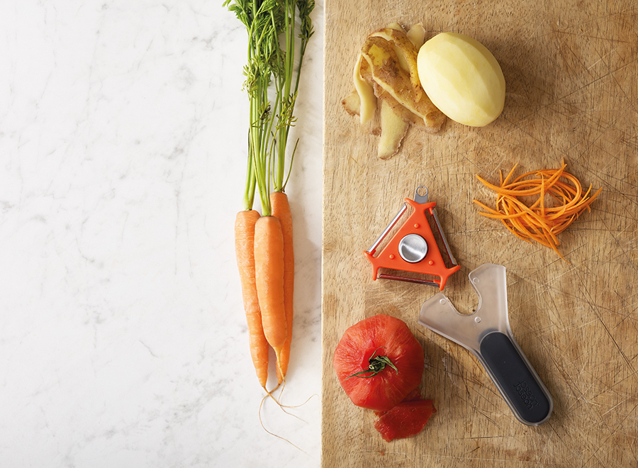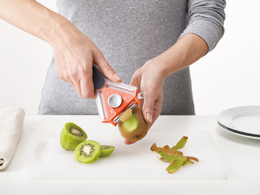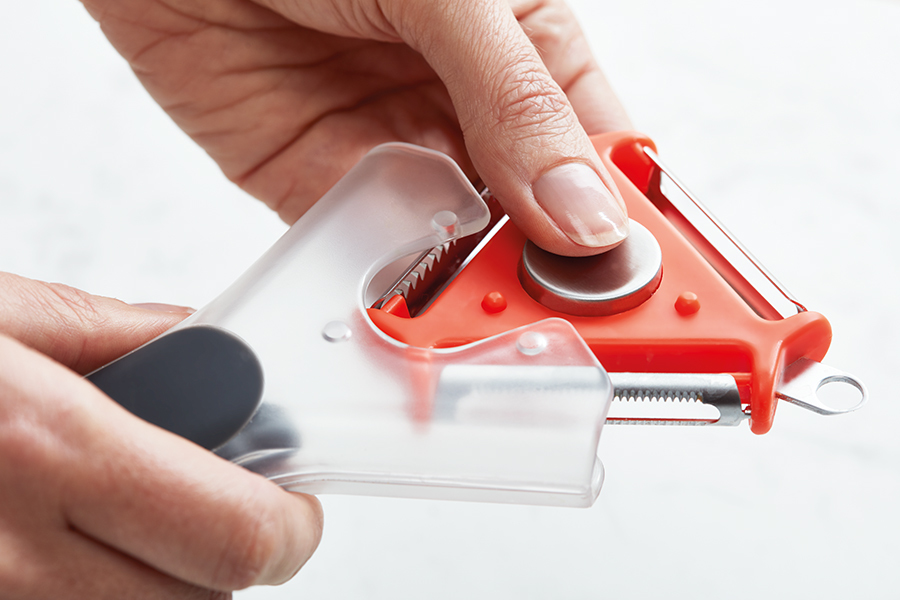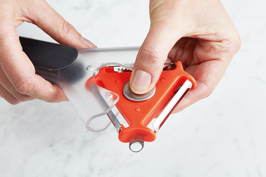 Уникальная овощечистка с тремя лезвиями (,обычное, для резки соломкой и для мягких фруктов), и удалителем картофельных «глазков». Овощечистка оснащена эргономичной ручкой, которая не выскальзывает во время использования.