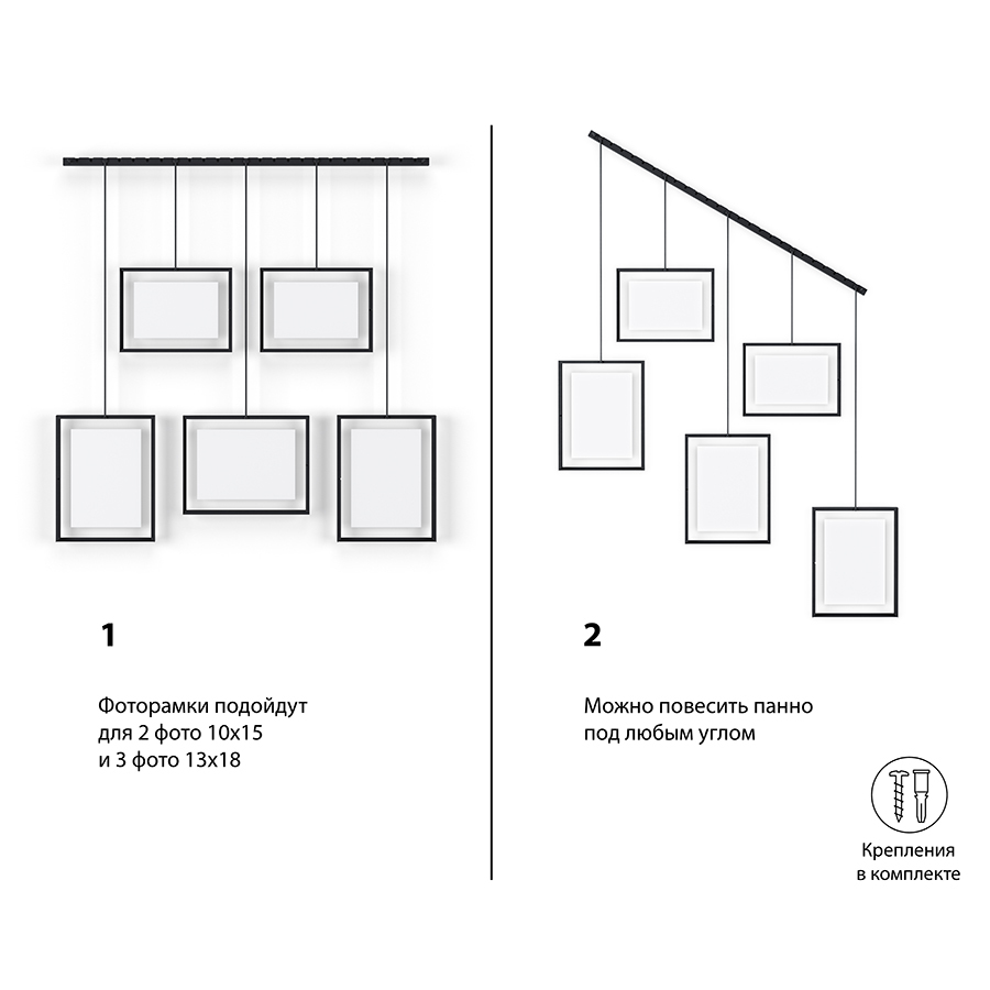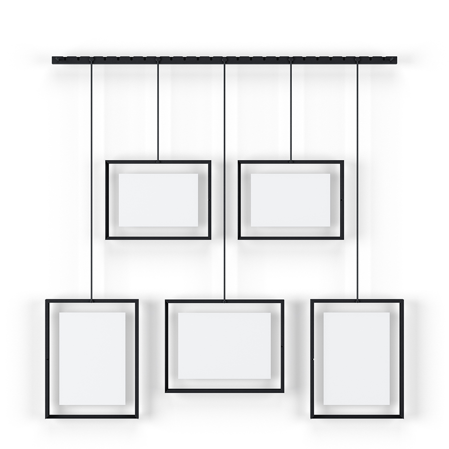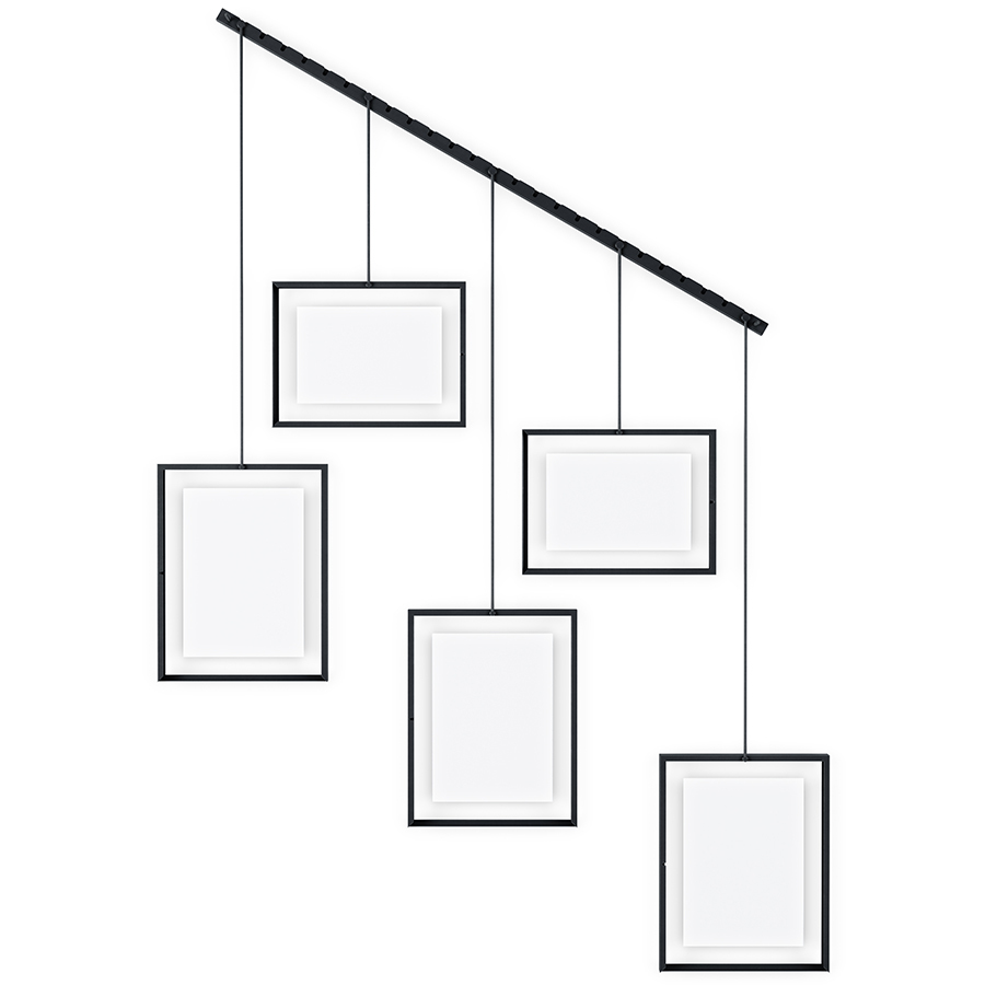 Панно для фотографий Exhibit гармонично впишется в любой интерьер городской квартиры или загородного дома. Дисплей состоит из 5 рамок, смонтированных по горизонтали под разным углом. Помимо фотографий панно подойдет для создания коллажей из писем, открыток или даже засушенных растений. Рамки выполнены из стали и покрыты черной порошковой краской. Каждый снимок или картинка прячется под стеклом. Все рамы зафиксированы на единой планке с помощью зажимов. Основание крепится к стене на шурупы и дюбели, которые входят в комплект.