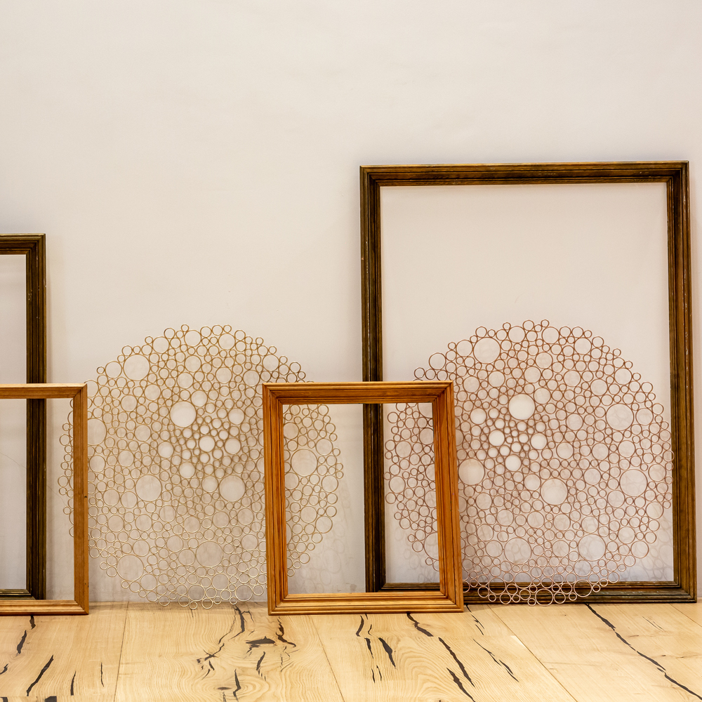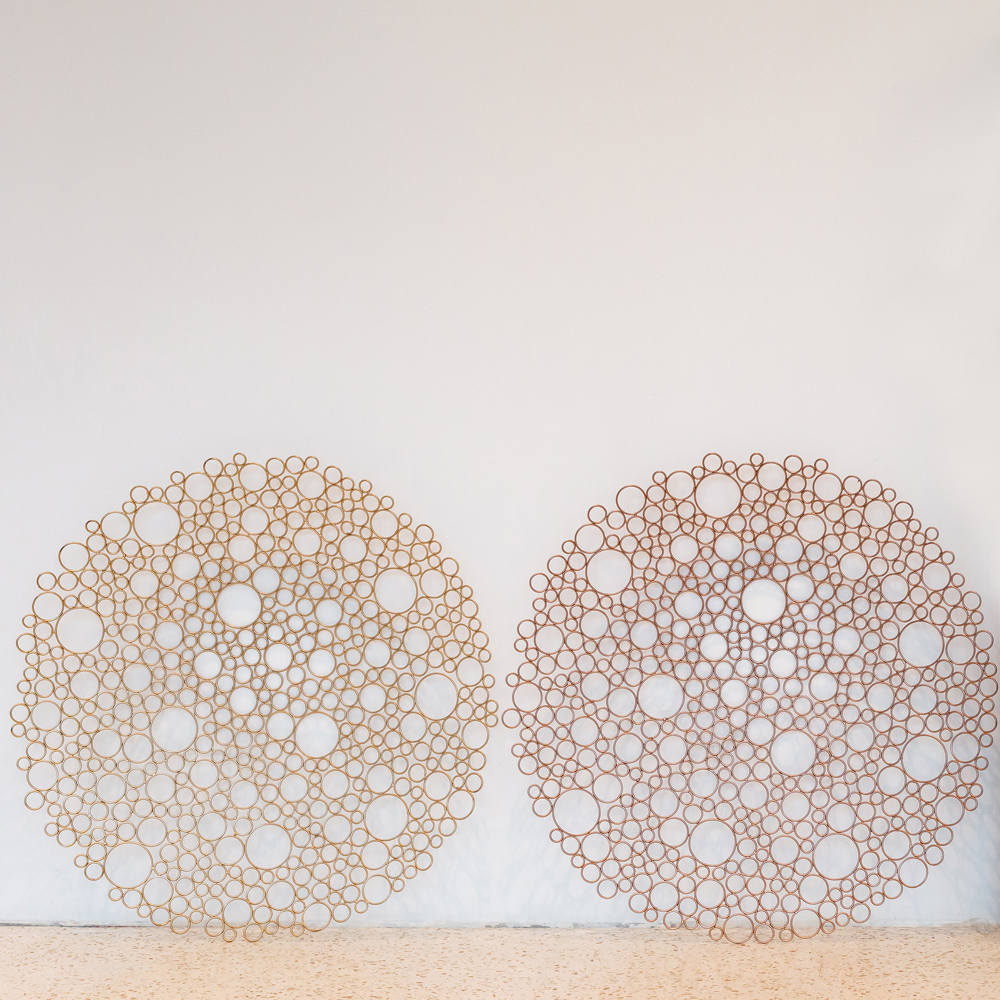 Панно Аура - атмосферное украшение, разделяющее с интерьером легкость и простор. Панно объемно, - воздушную картину рисуют не только тонкие металлические пузырики, но и тень, обводящая формы панно на стене. Золоченый металл, богатый плавными световыми отражениями, гармоничен любым окружающим расцветкам.