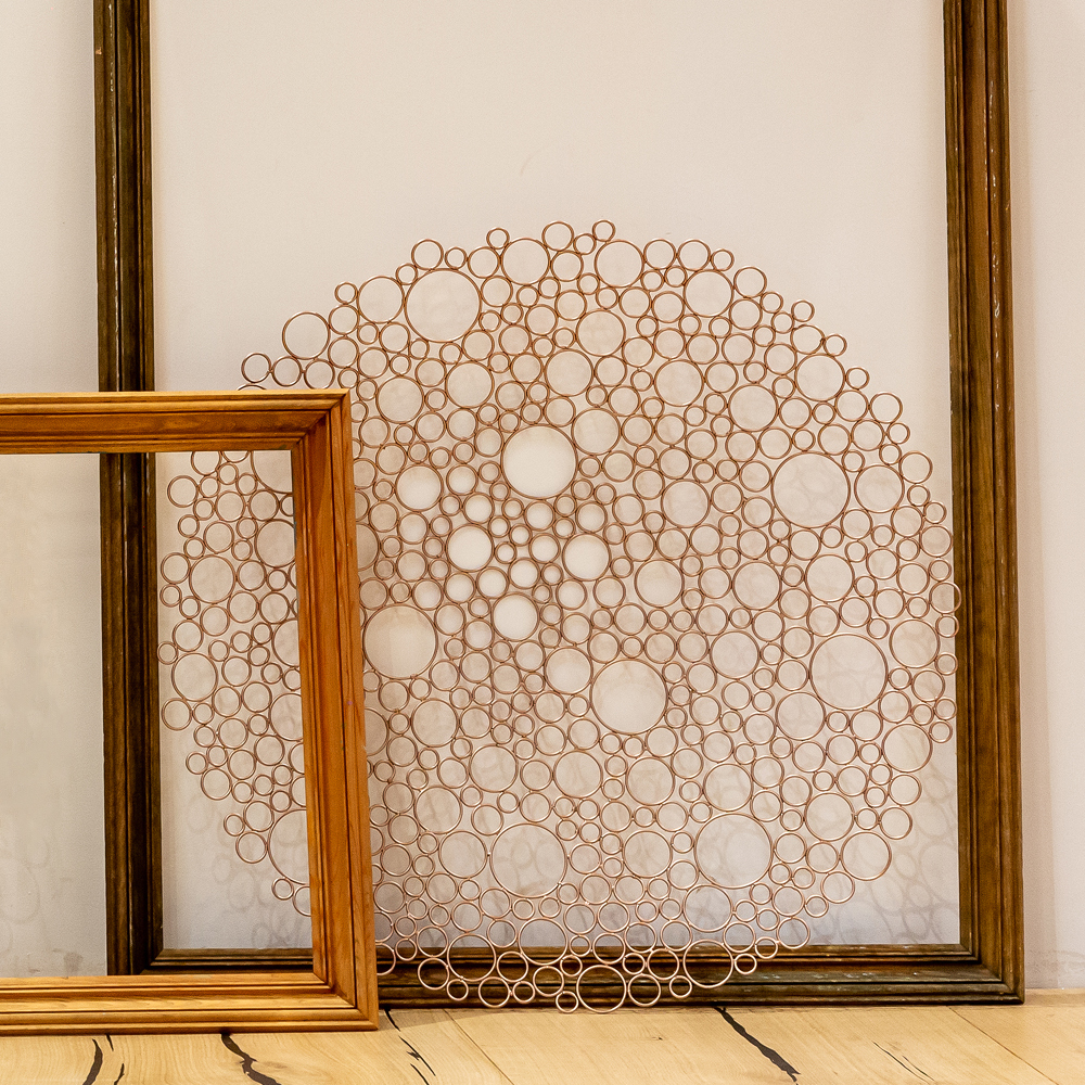 Панно Аура - атмосферное украшение, разделяющее с интерьером легкость и простор. Воздушный эффект принадлежит не только тончайшим контурам панно, но и нежнейшему цвету розовое золото, - дизайнерской новинке 2020, словно бы специально смешанной для этого невесомого элегантного панно.