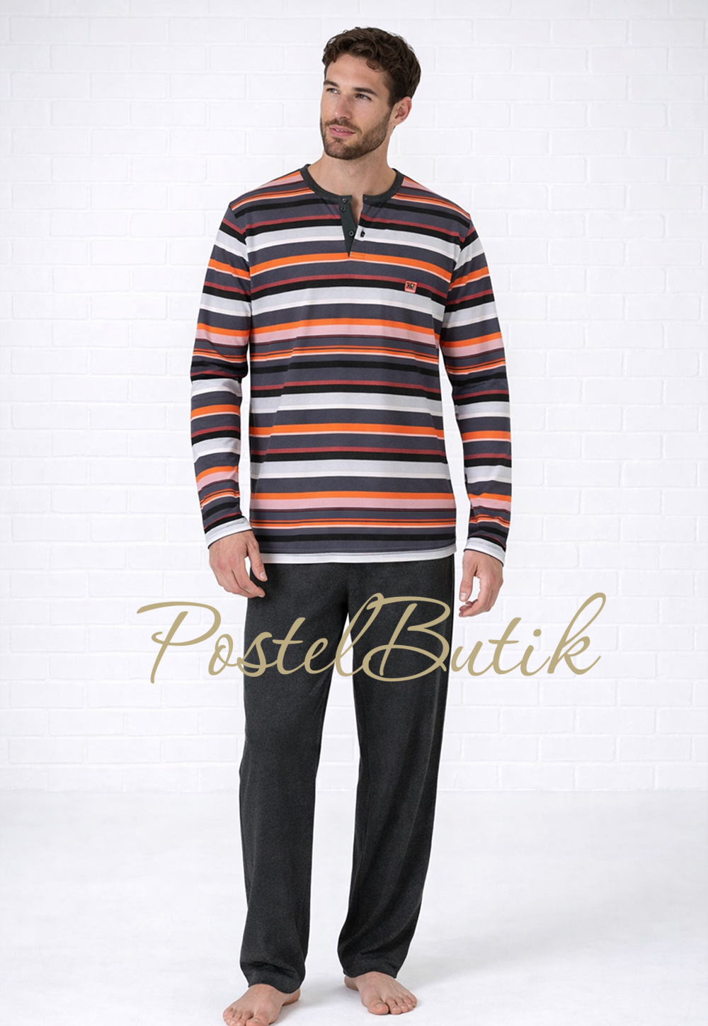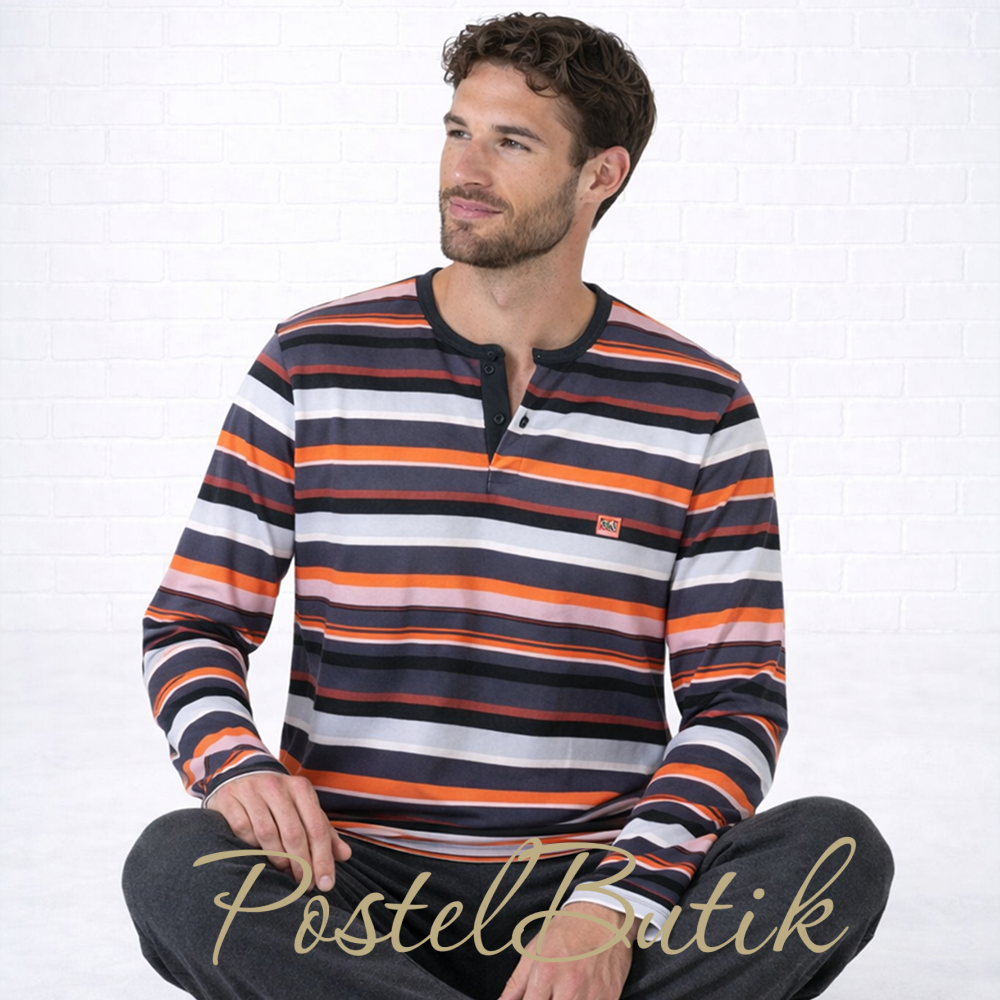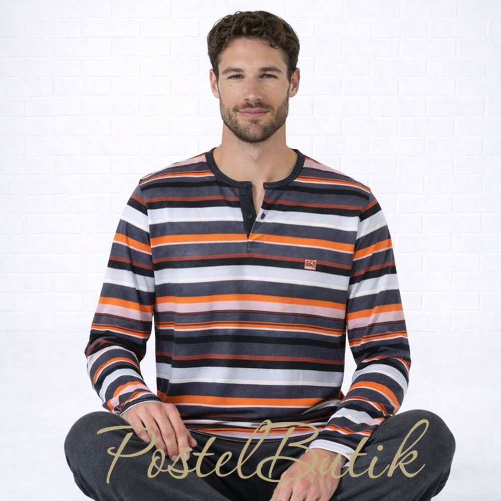 Мужская пижама Massana H47 ORANGE — удобный комплект для сна и домашнего отдыха. Верх выполнен в стильную полоску с акцентом на оранжевые оттенки, а низ — в спокойном сером цвете. Практичное сочетание материалов обеспечивает комфорт и износостойкость на каждый день.