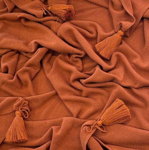 • Уникальный дизайн с историей: По краям пледа — съемные кисти ручной работы, которые являются его фирменным акцентом. В комплекте вы получаете второй набор кистей другого цвета в подарок, позволяя в два клика менять настроение аксессуара, подстраивая его под свой образ или интерьер.