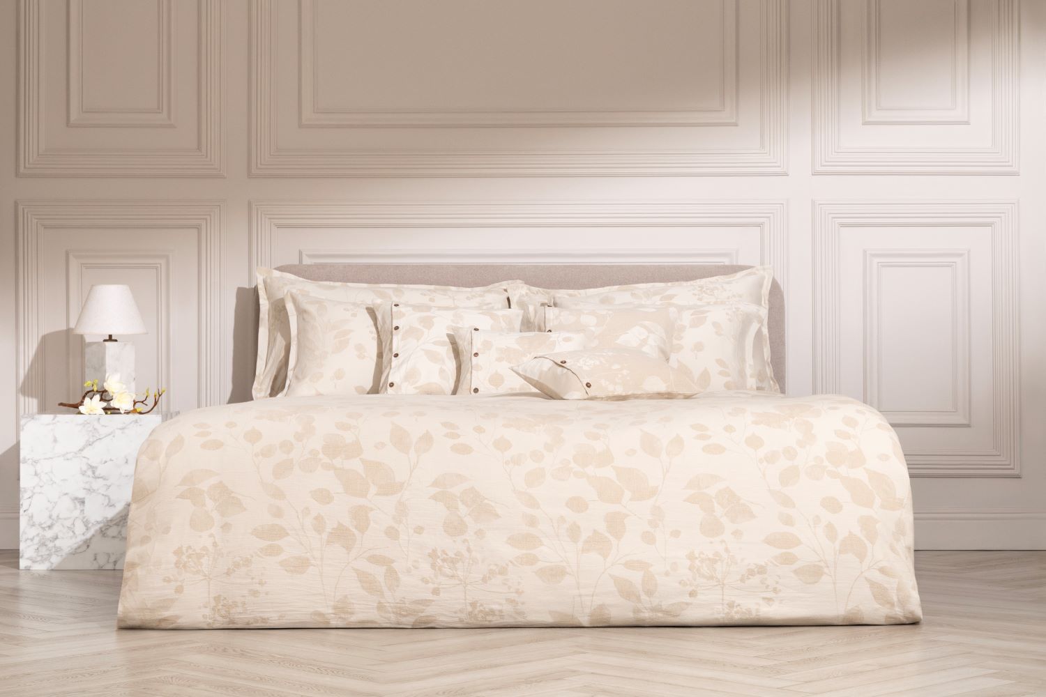 Natural Palette Grass – это постельное белье из мерцающего жаккарда природных оттенков с завораживающим рисунком из листьев и цветов