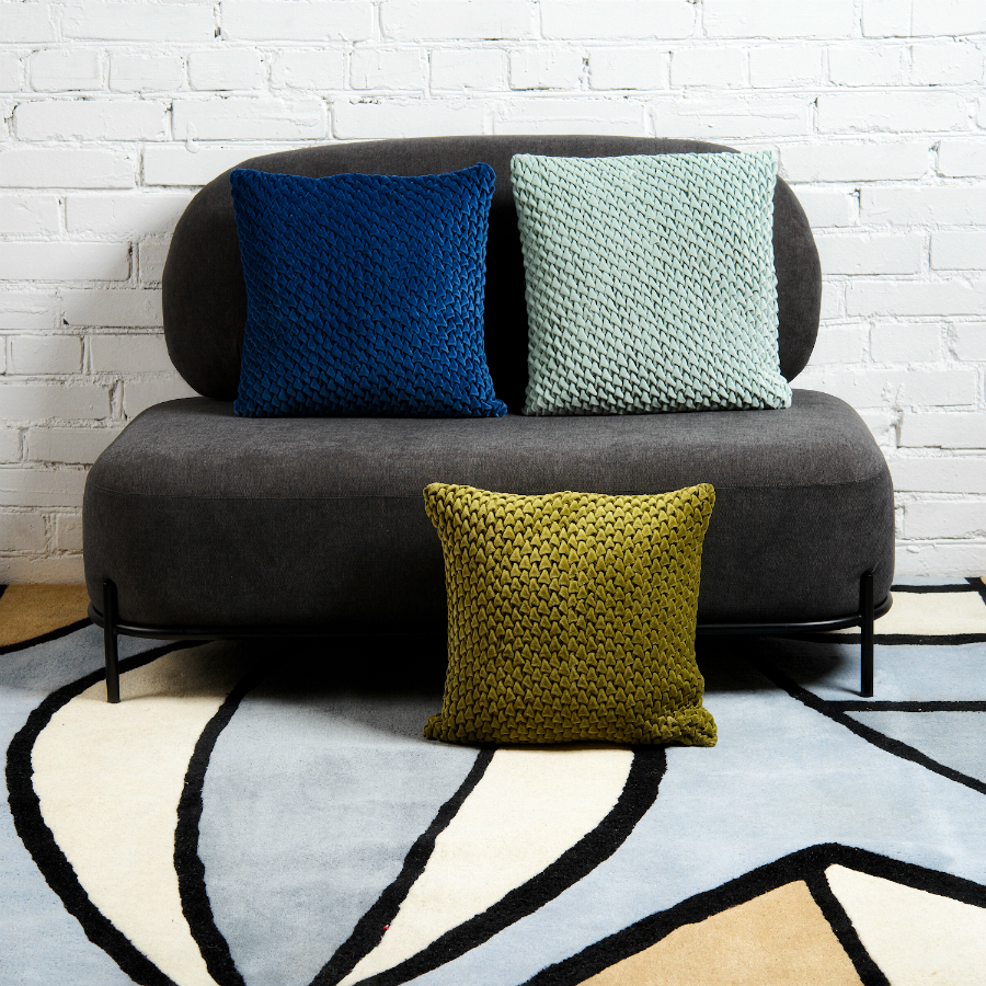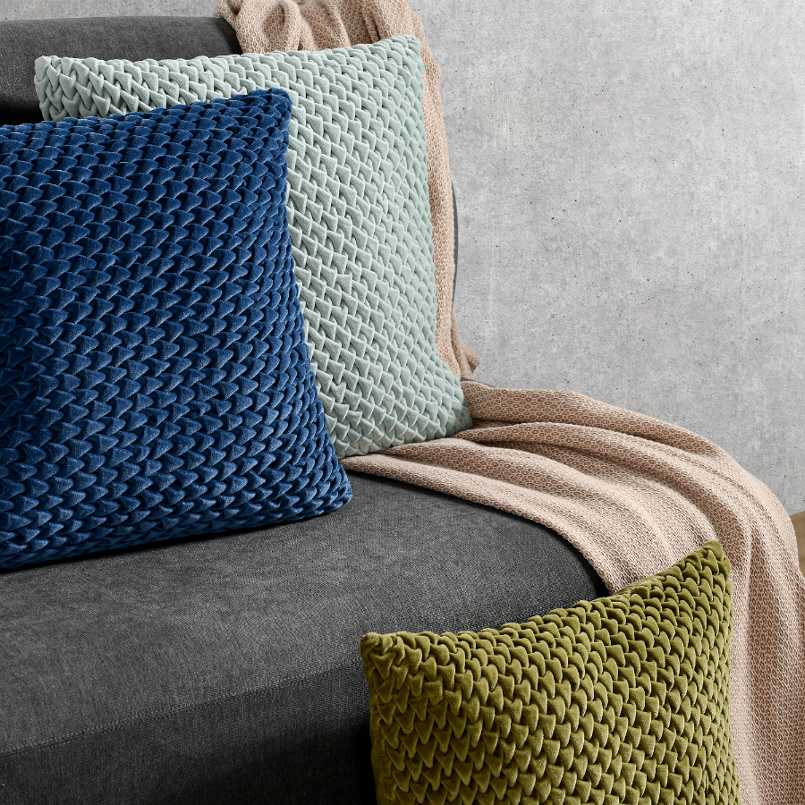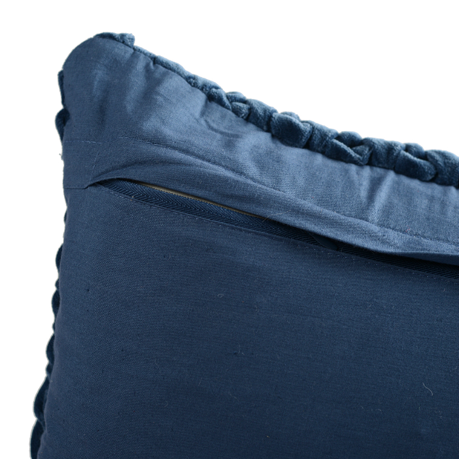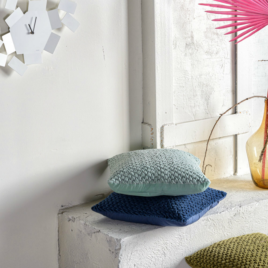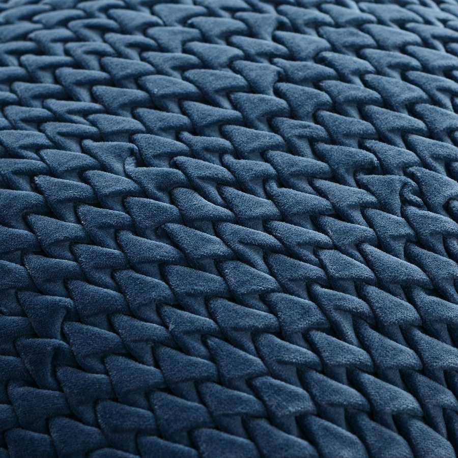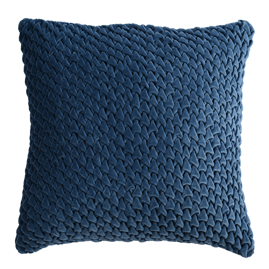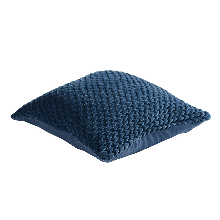 Декоративная подушка с фактурным стеганым узором выполнена из прочного хлопкового бархата. Нежный, приятный на ощупь материал не электризуется, не вызывает аллергию, и за ним легко ухаживать. За счет плотного наполнителя изделие синего оттенка хорошо держит форму.