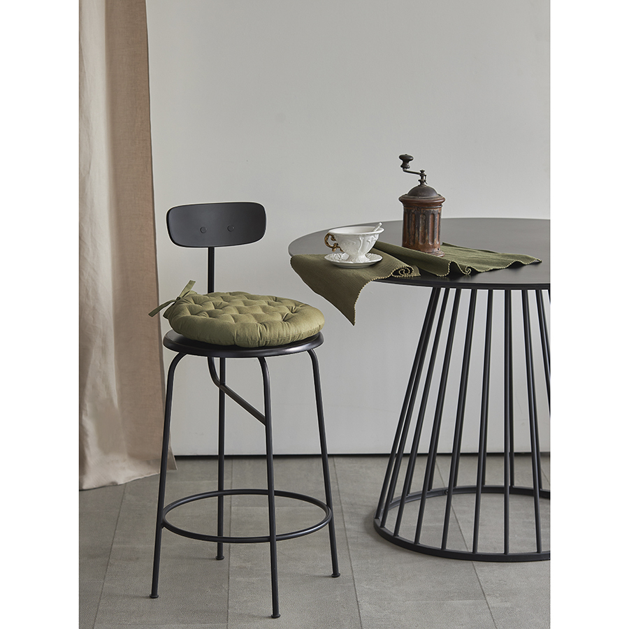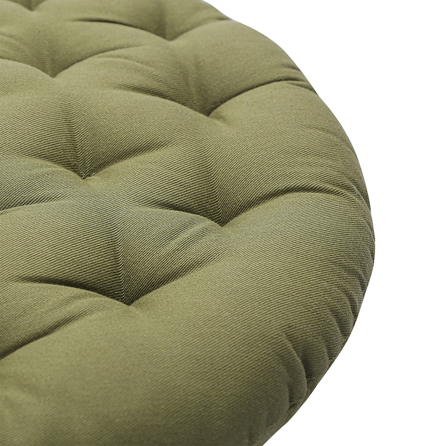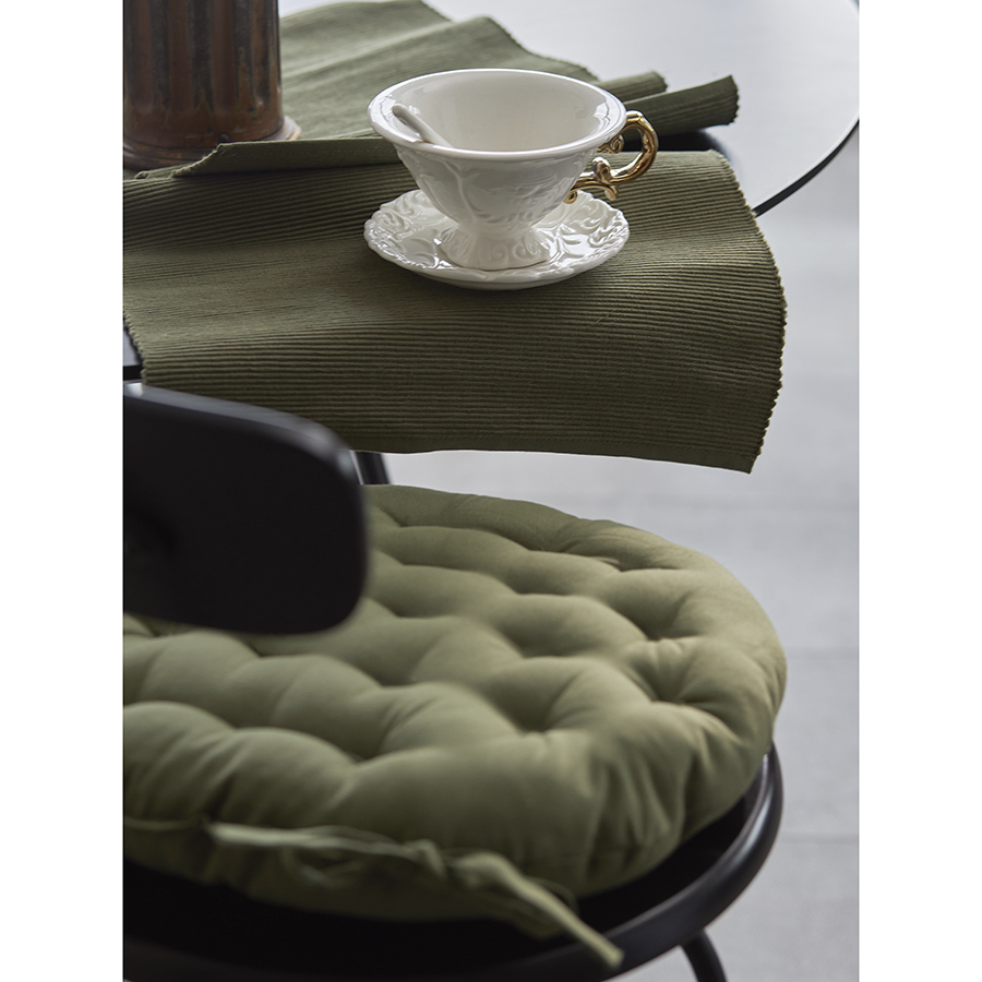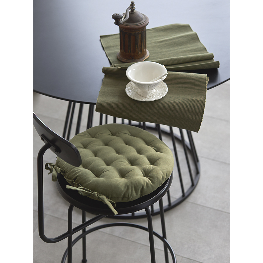 Подушка круглая оливкового цвета из коллекции Essential станет отличным дополнением к вашей кухонной мебели. Ее можно использовать в качестве мягкой накладки на деревянные или металлические стулья, чтобы сделать их жесткую поверхность более удобной для сидения. Подушка легко фиксируется на ножках мебели с помощью специальных завязок. Однотонное изделие в лаконичном дизайне органично вписывается в любой современный интерьер. Чехол подушки изготовлен из экологичного и долговечного 100% хлопка. В качестве наполнителя используется плотный полиэстер, который позволяет изделию сохранять первоначальную форму на протяжении всего срока службы.