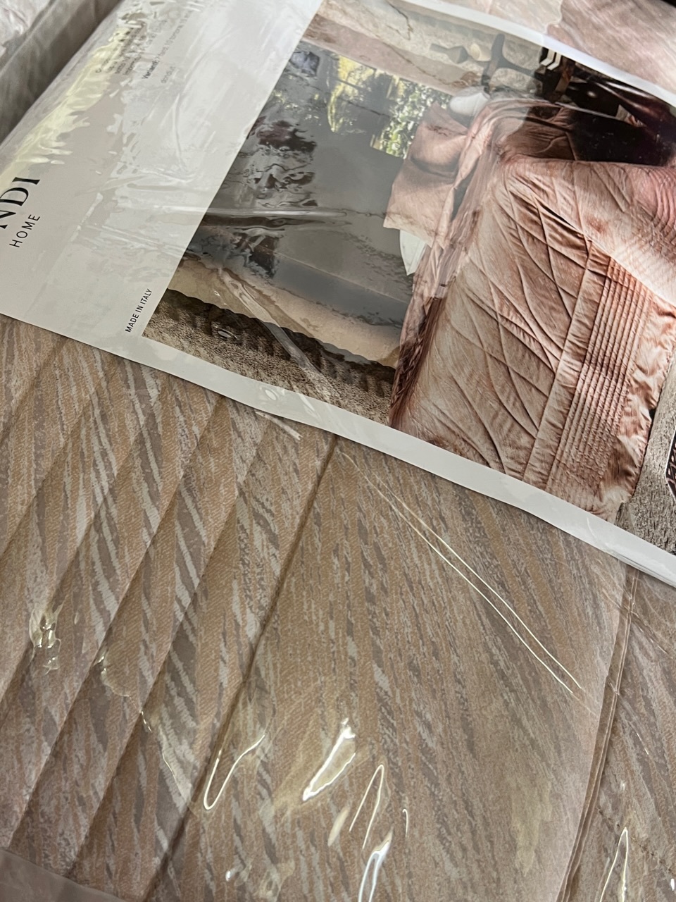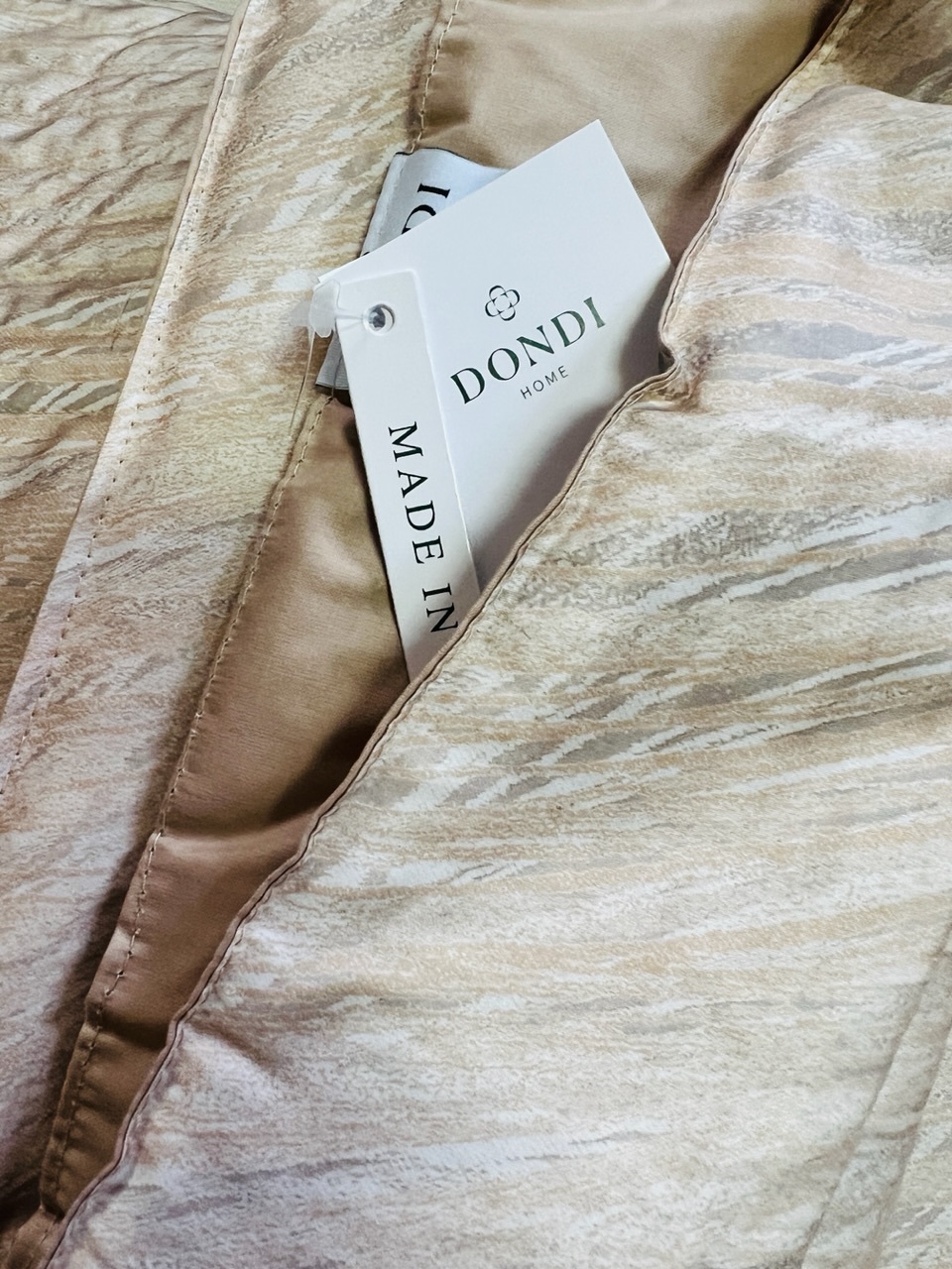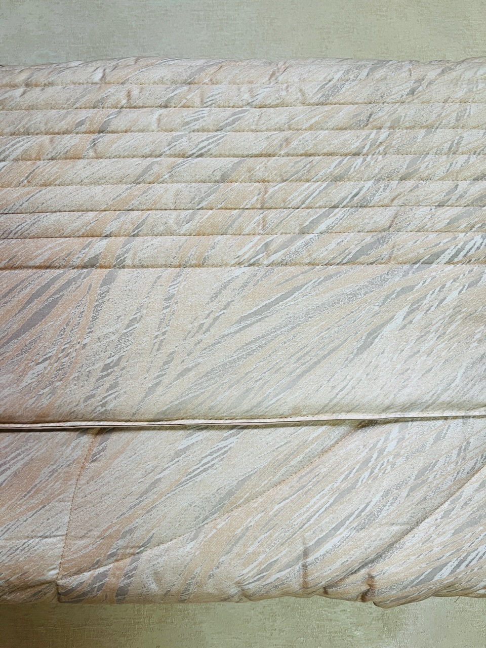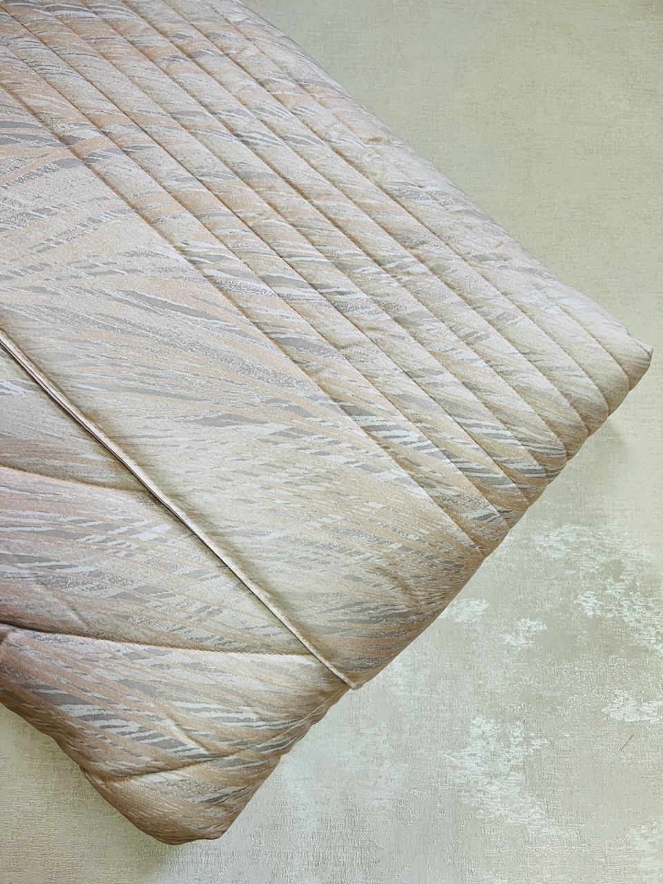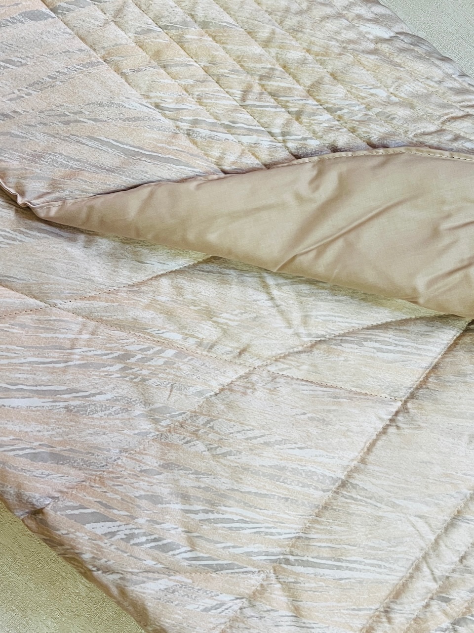 Свежий нетривиальный дизайн, стеганое двуспальное покрывало с абстрактным узором на хлопковом атласе. Шелковистое. Теплый бежевый оттенок.