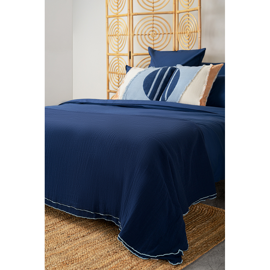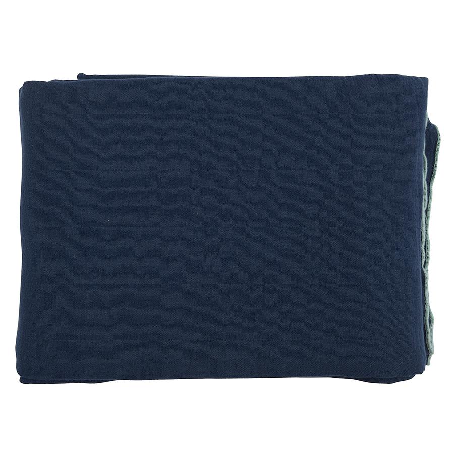 Покрывало легкое из хлопка темно-синего цвета с контрастным голубым кантом из коллекции Essential подойдет для любого интерьера. Однотонная модель будет сочетаться с любым постельным бельем, пледом и декоративными подушками. Хлопковый материал не вызывает аллергии, хорошо пропускает воздух, не электризуется, и на нем не образуются катышки. Покрывало представлено в двух размерах.