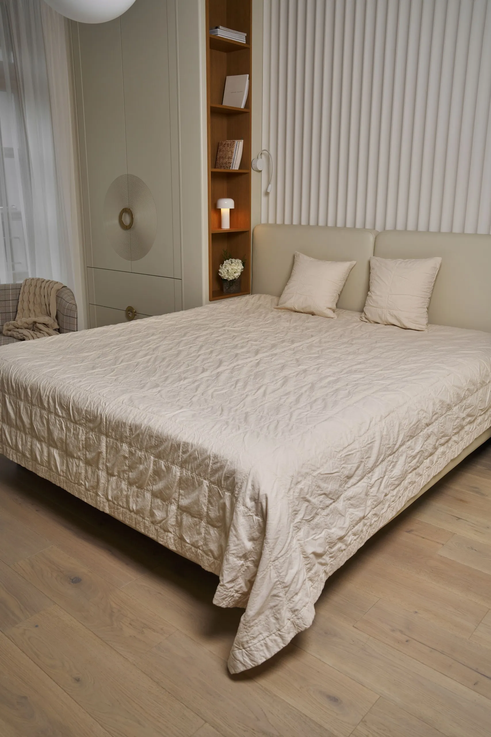 Изделие подойдёт для оформления кровати, защиты постельного белья и создания аккуратного интерьерного акцента. Цвет экрю легко сочетается с базовыми и природными оттенками интерьера, поэтому текстиль можно использовать как самостоятельный акцент или как часть готового комплекта.