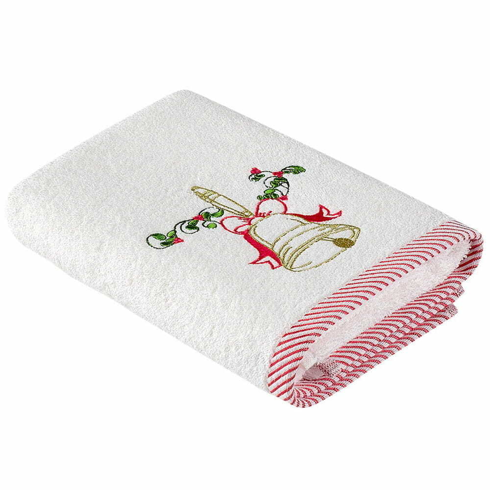 Полотенце Arya модель Bell с вышивкой в виде новогоднего колокольчика. Полотенце изготовлено из натурального хлопка. Основной цвет белый с красной каймой.