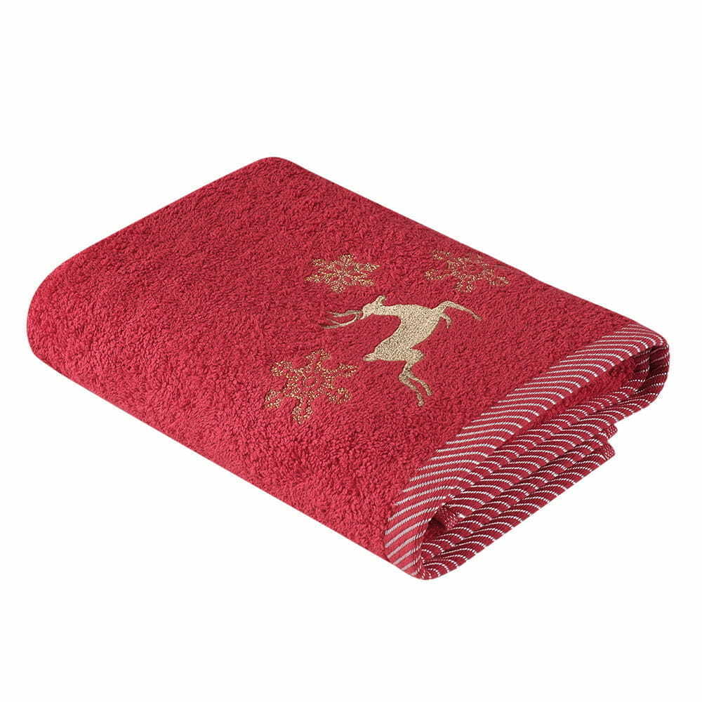 Полотенце Arya модель Gold Deer с вышивкой в виде золотого оленя и снежинок. Полотенце изготовлено из натурального хлопка. Цвет полотенца красный.