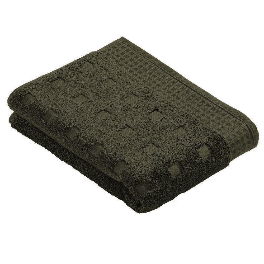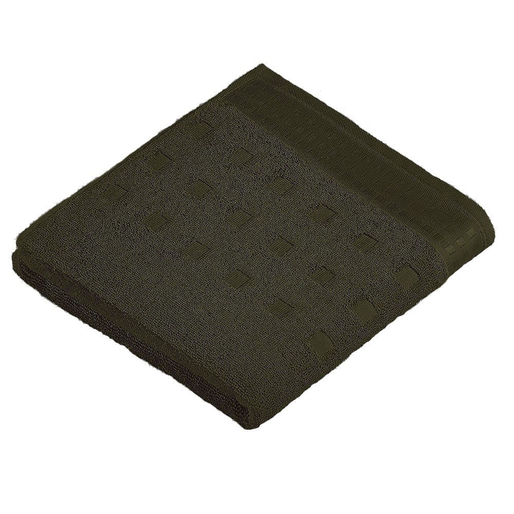 Полотенце тёмно-зелёного цвета с рисунком в виде квадратиков, такие же квадратики на бордюре полотенца, это придает им современную элегантность. Изготовлено из натурального органического хлопка.