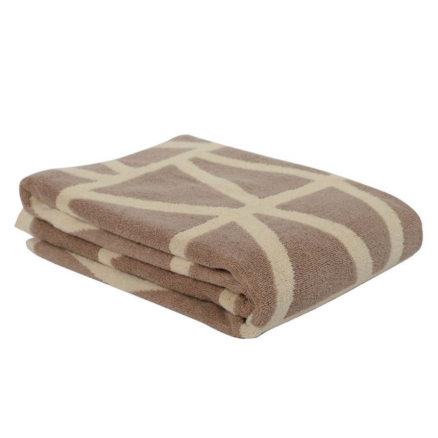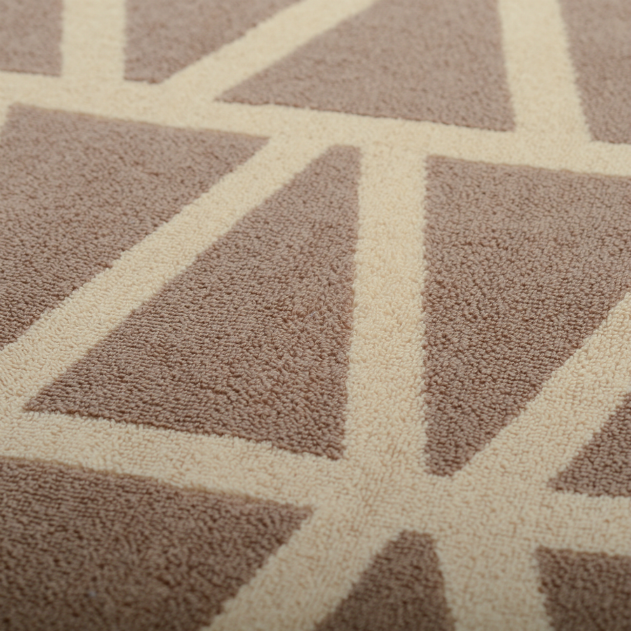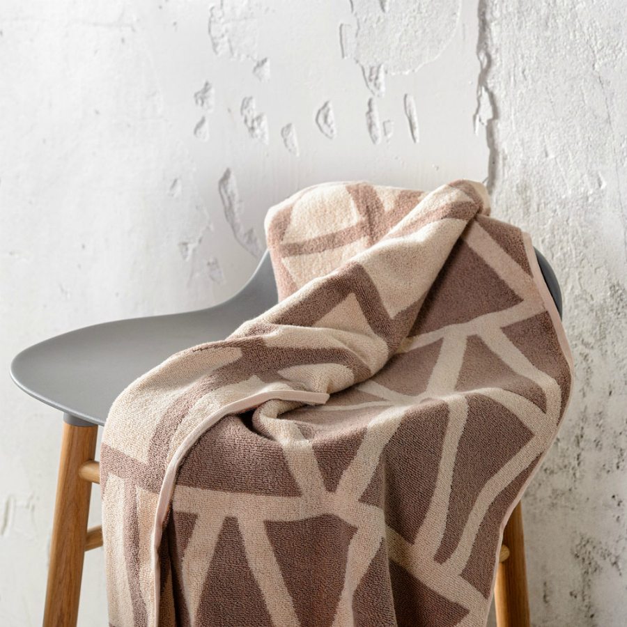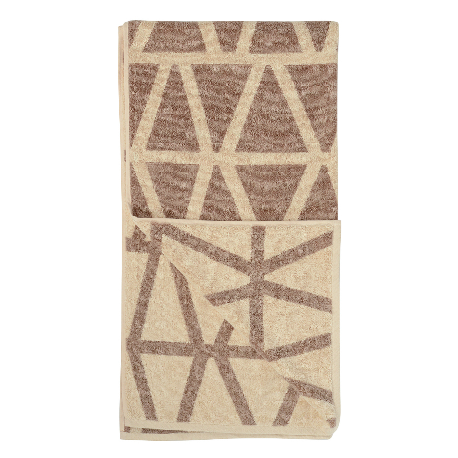 При создании полотенца коричнево-бежевого цвета использовался мягкий, приятный на ощупь хлопок. Фактурный материал отлично впитывает влагу, быстро сохнет и не деформируется после множества стирок. Модель украшена авторским принтом Geometry.