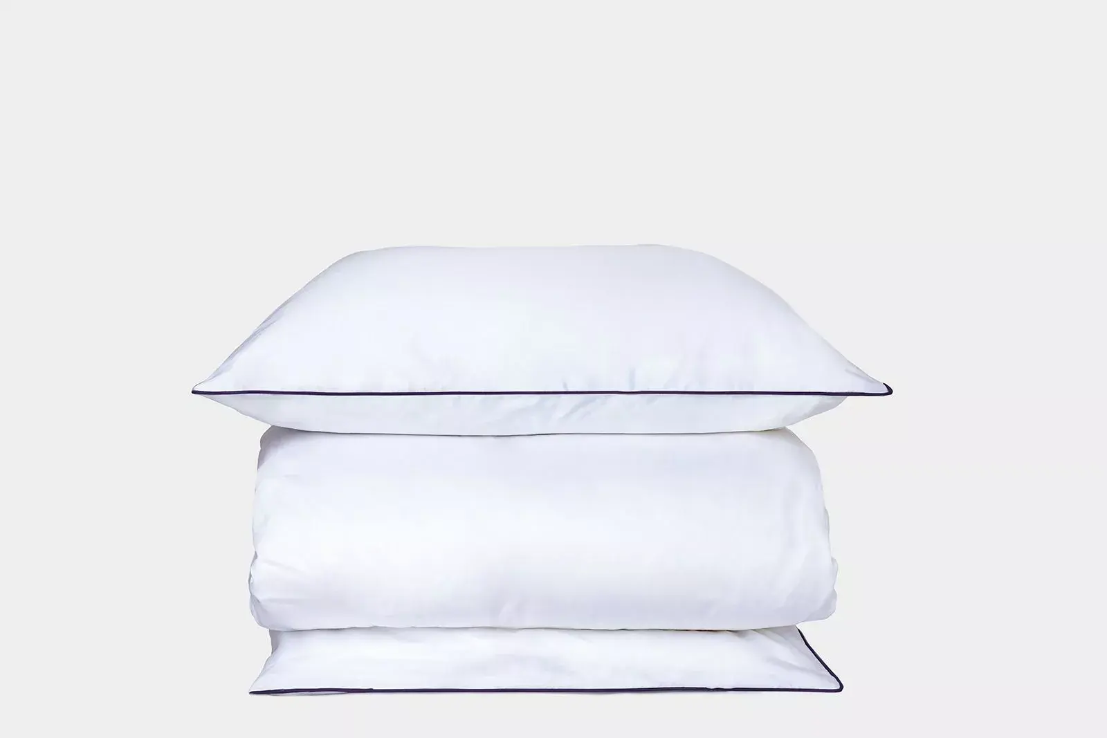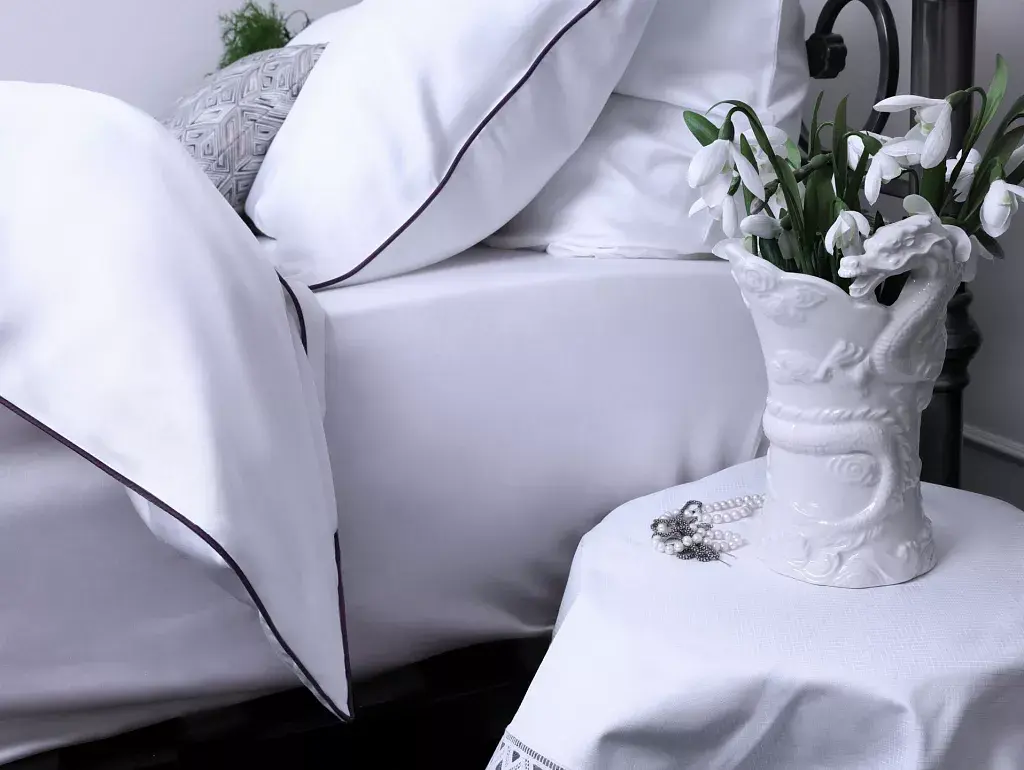 Белый — цвет кристальной чистоты, невинности и морозной свежести. Он отлично сочетается с другими красками и выступает в роли абсолютно нейтрального фона. Неудивительно, что постельное белье этого оттенка пользуется огромной популярностью. Mollen тоже не устояли — но дополнили комплект небольшой стильной деталью.