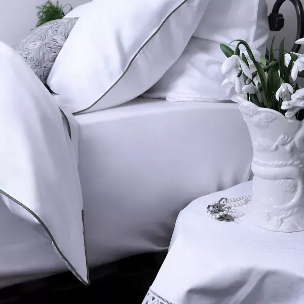 Белый — цвет кристальной чистоты, невинности и морозной свежести. Он отлично сочетается с другими красками и выступает в роли абсолютно нейтрального фона. Неудивительно, что постельное белье этого оттенка пользуется огромной популярностью. Mollen тоже не устояли — но дополнили комплект небольшой стильной деталью.