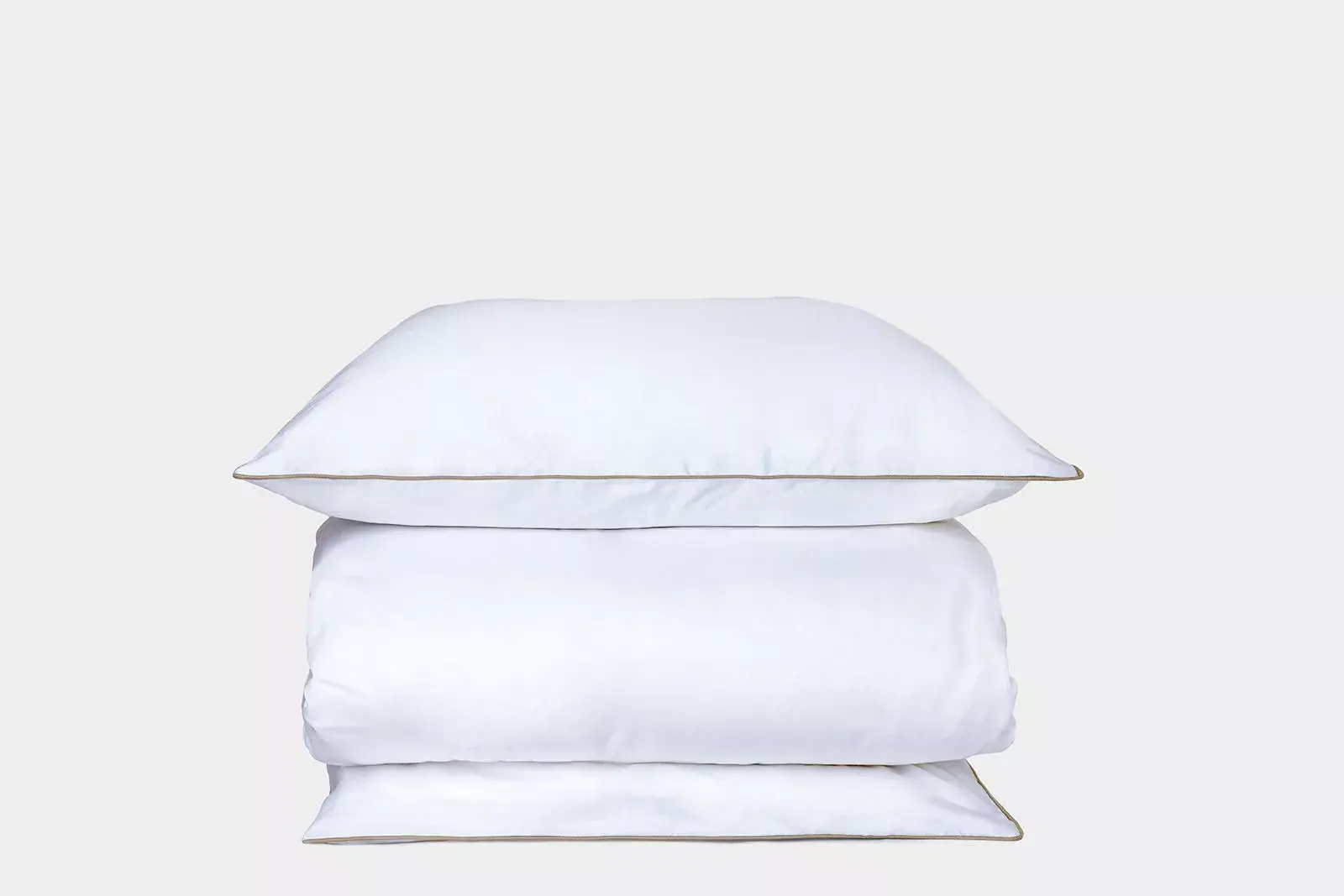 Белый — цвет кристальной чистоты, невинности и морозной свежести. Он отлично сочетается с другими красками и выступает в роли абсолютно нейтрального фона. Неудивительно, что постельное белье этого оттенка пользуется огромной популярностью. Mollen тоже не устояли — но дополнили комплект небольшой стильной деталью.