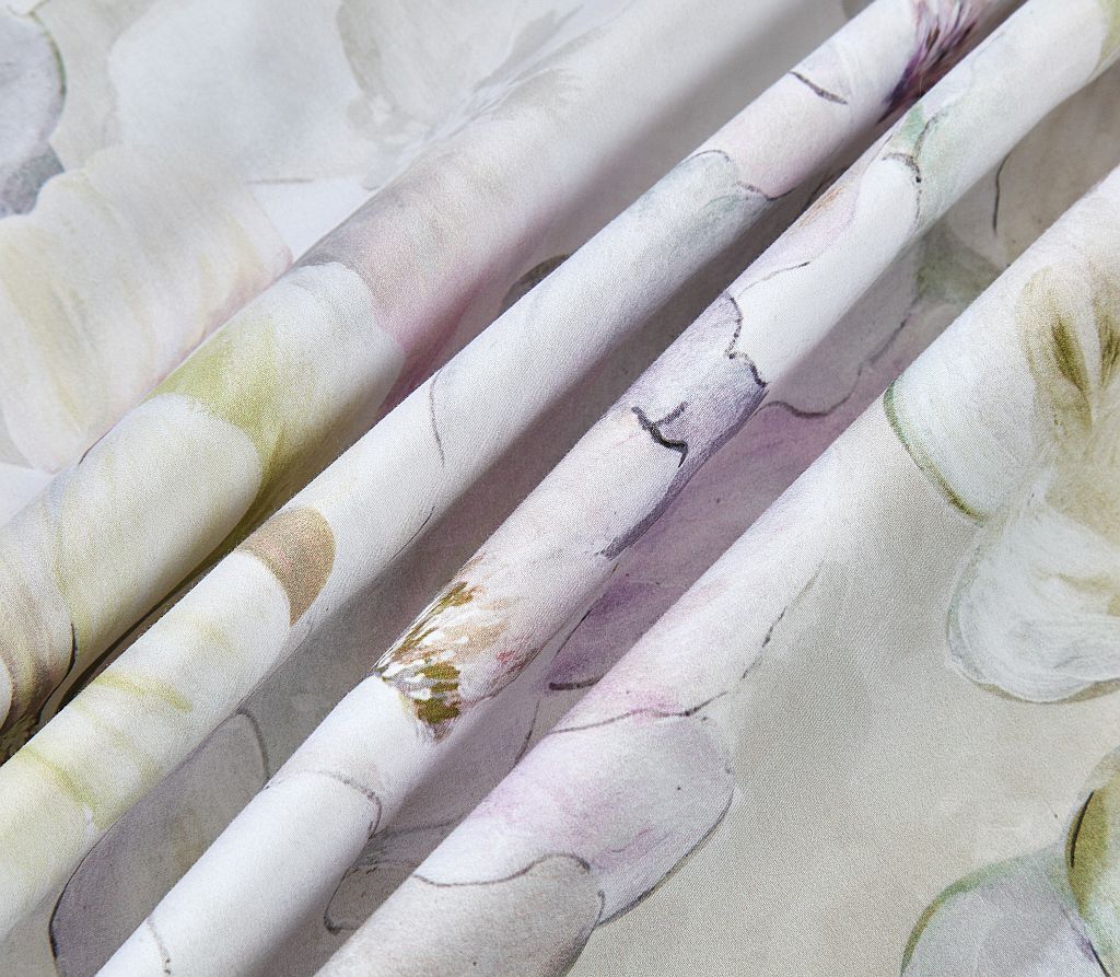 Пышные бутоны пионов пастельных тонов в акварельной технике в комплекте с однотонной простыней цвета матча-латте.