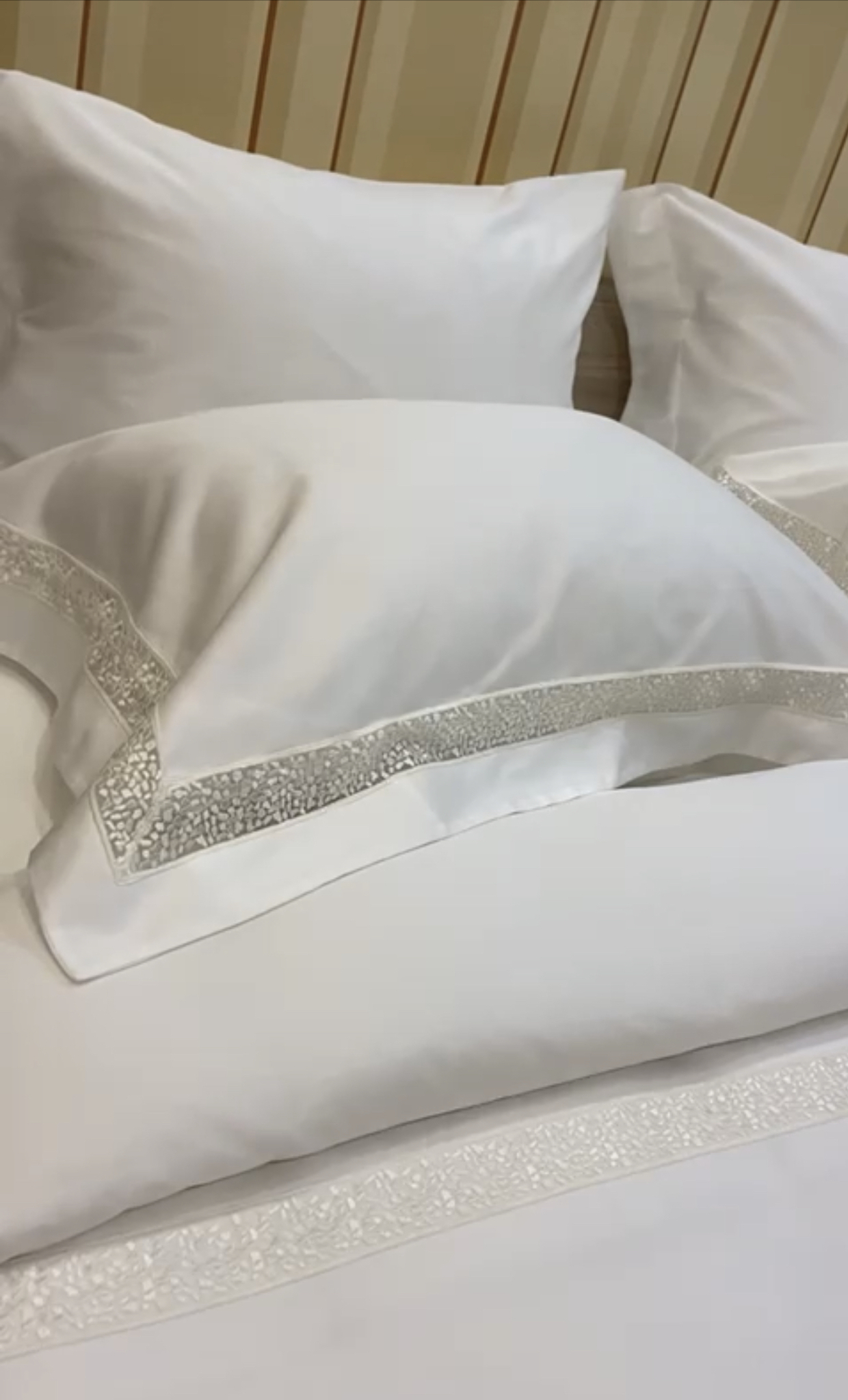 Наволочки с трех сторон и верхняя часть пододеяльника декорированы кружевным бордюром шириной 4 см.