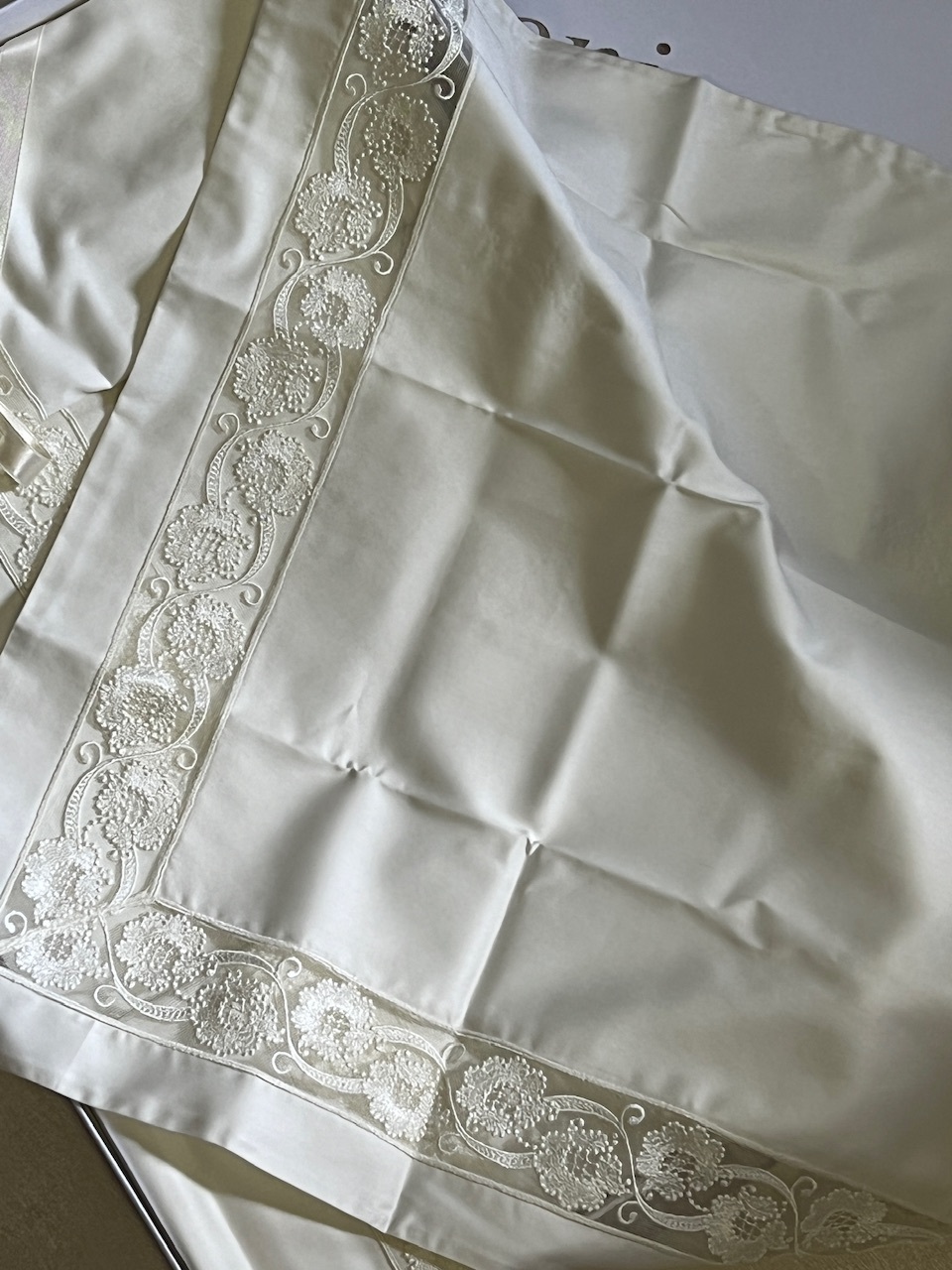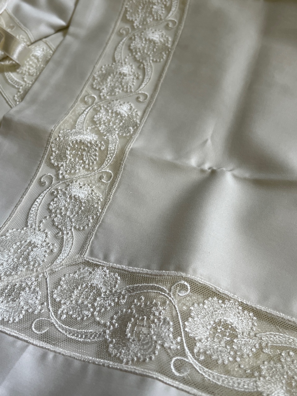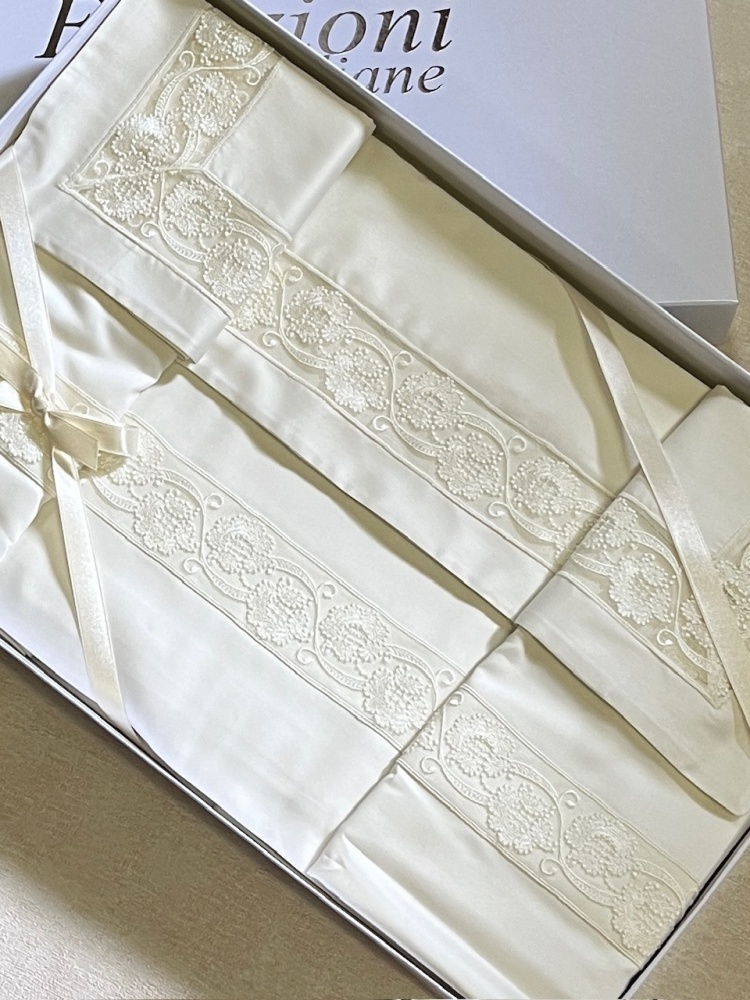 Основной фон в цвете шампань украшен кружевом в светлых тонах. Наволочки с трех сторон и верхняя часть пододеяльника декорированы кружевным бордюром шириной 4 см. Простынь большая прямая.