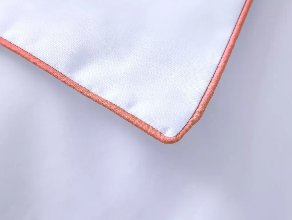 Это объемный кант насыщенного розово-кораллового оттенка. Цвет идеально вписывается в стиль Mollen: яркий, но не вызывающий, органично сочетающийся с самыми разными оттенками. Кант задает отчетливый ритм и превращает банальный комплект постельного белья в лаконичный дизайнерский шедевр.