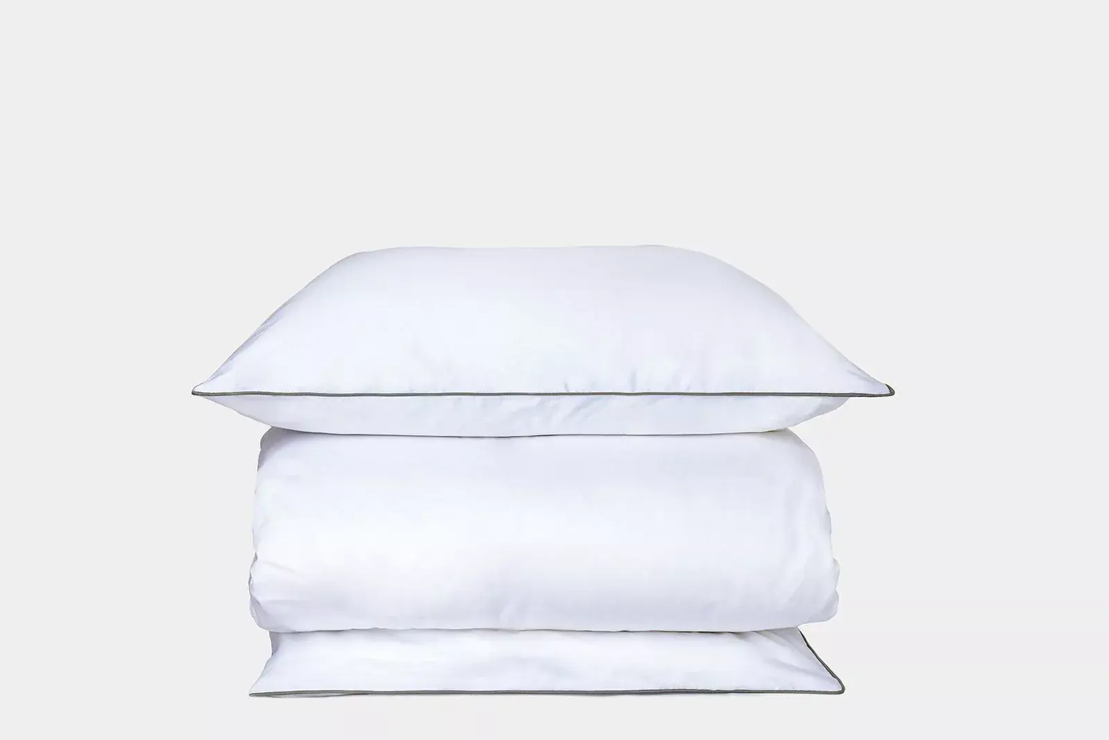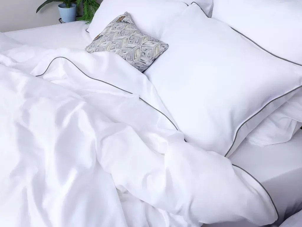 Белый — цвет кристальной чистоты, невинности и морозной свежести. Он отлично сочетается с другими красками и выступает в роли абсолютно нейтрального фона. Неудивительно, что постельное белье этого оттенка пользуется огромной популярностью. Mollen тоже не устояли — но дополнили комплект небольшой стильной деталью.