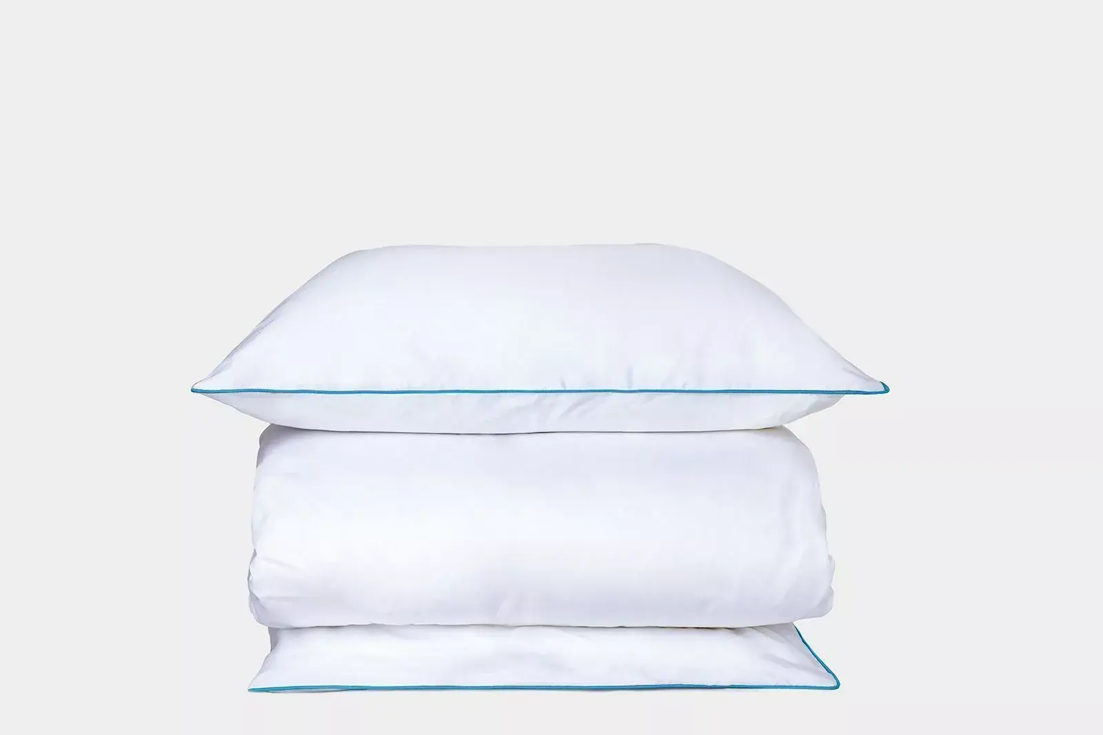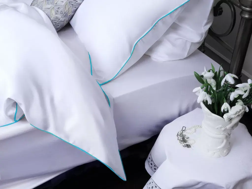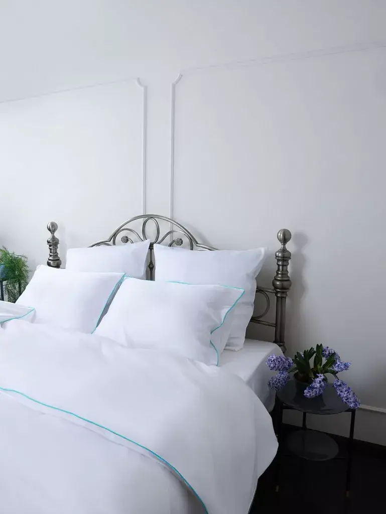 Это объемный кант насыщенного светло-бирюзового оттенка. Цвет идеально вписывается в стиль Mollen: яркий, но не вызывающий, органично сочетающийся с самыми разными оттенками. Кант задает отчетливый ритм и превращает банальный комплект постельного белья в лаконичный дизайнерский шедевр.