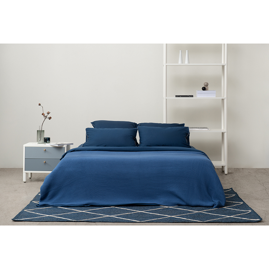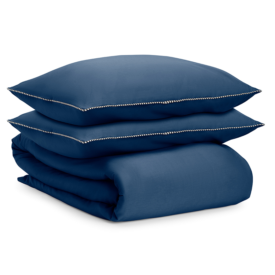 Комплект постельного белья темно-синего цвета с контрастным кантом на наволочках из коллекции Essential понравится любителям однотонного текстиля. В составе материала хлопок и тенсель (эвкалиптовое волокно).. Хлопок придает изделию легкость и отличные гигроскопические свойства. Благодаря тенселю ткань обладает бактерицидными свойствами и повышенной прочностью, меньше мнется и очень приятна к телу, напоминая одновременно шерсть и лен, поскольку сохраняет тепло и дает ощущение прохлады. Тенсель относится к экологически чистым волокнам, его производство не загрязняет окружающую среду. Плотность: 144 ТС В комплекте: пододеяльник 200х220 см, застегивающийся на молнию, и две наволочки 50х70 см с системой закрытия клапан. Упаковка: тканевый мешочек. Состав - 52%, хлопок/ 48%, тенсель (эвкалиптовое волокно). ! Максимальная температура стирки 40°C ! Гладить при максимальной температуре 110°C ! Возможна барабанная сушка при низкой температуре ! Не отбеливать ! Сухая чистка запрещена