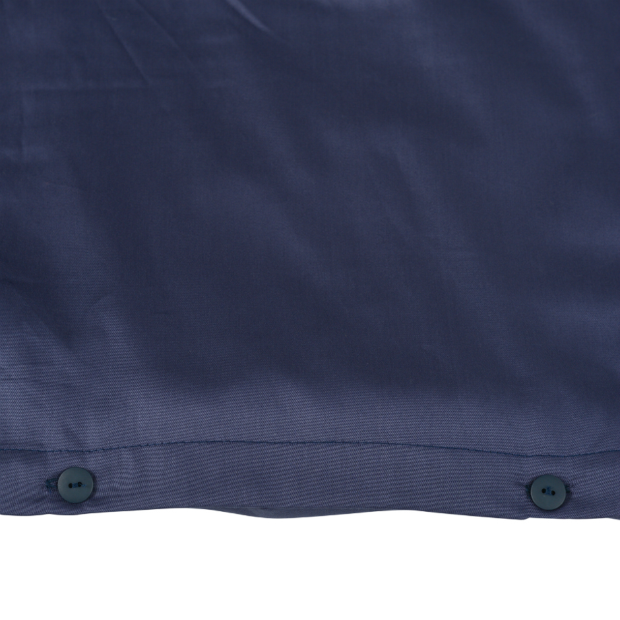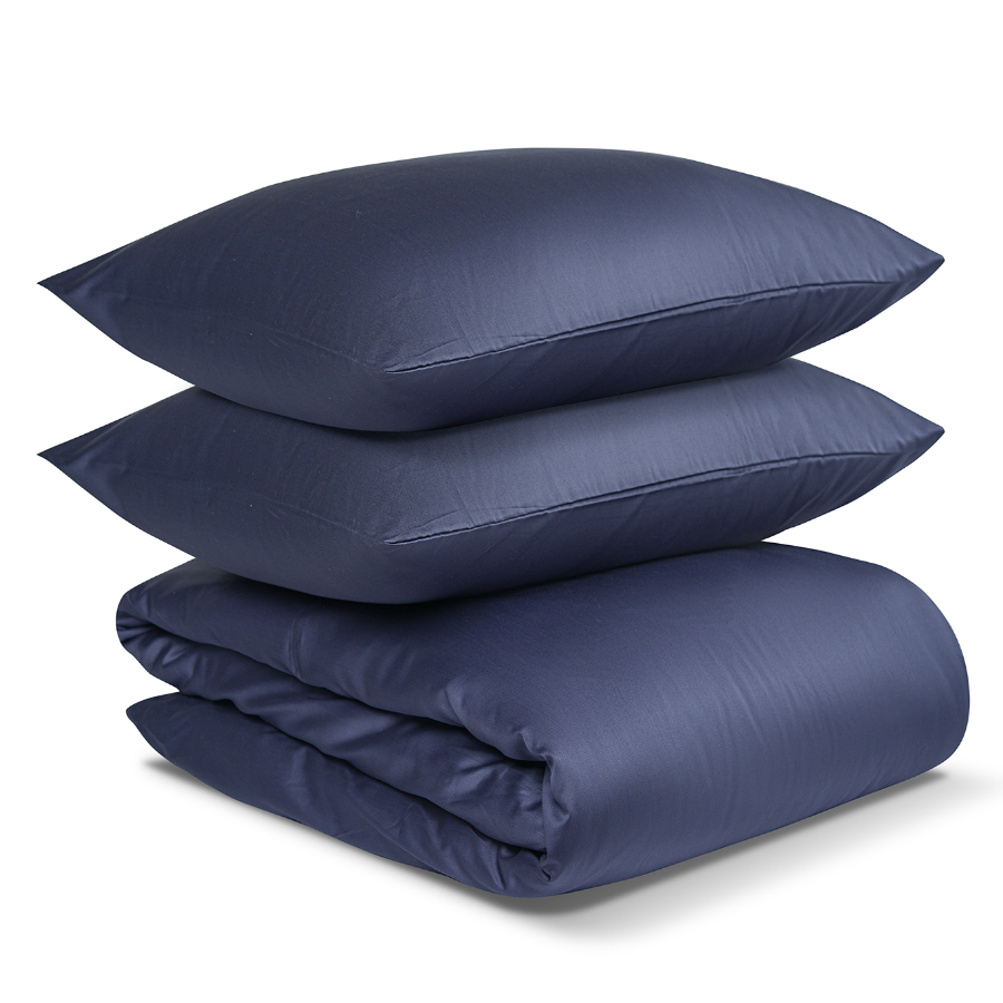 Пододеяльник и две наволочки 50х70 выполнены из плотного хлопкового сатина. Приятный на ощупь материал хорошо пропускает воздух, обеспечивая коже комфорт в течение сна. Однотонный комплект изготовлен в насыщенном синем оттенке.