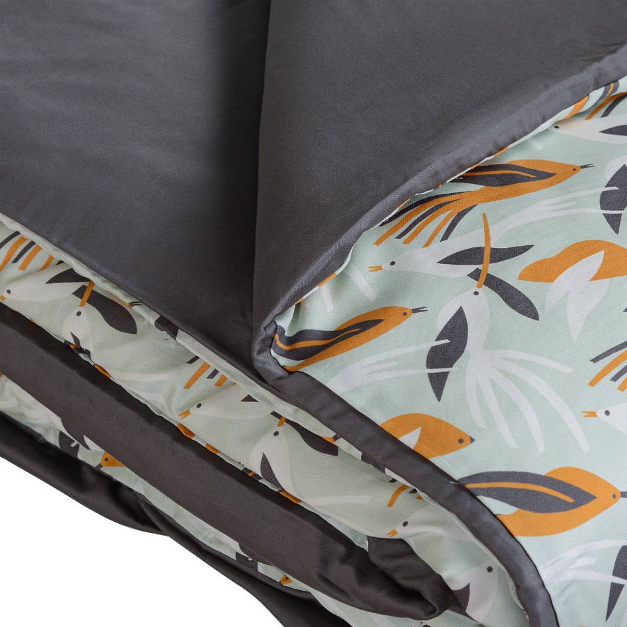 Сатиновый комплект постельного белья плотностью 210ТС в благородном темно-сером оттенке. Пододеяльник и наволочки украшены изящным «птичьим» принтом, навевающим ассоциации со свободным полетом и теплом. Белье сшито из 100%, натурального хлопка и очень приятно ощущается к телу.Размер: пододеяльник – 200х220 см, две наволочки по 50х70 см