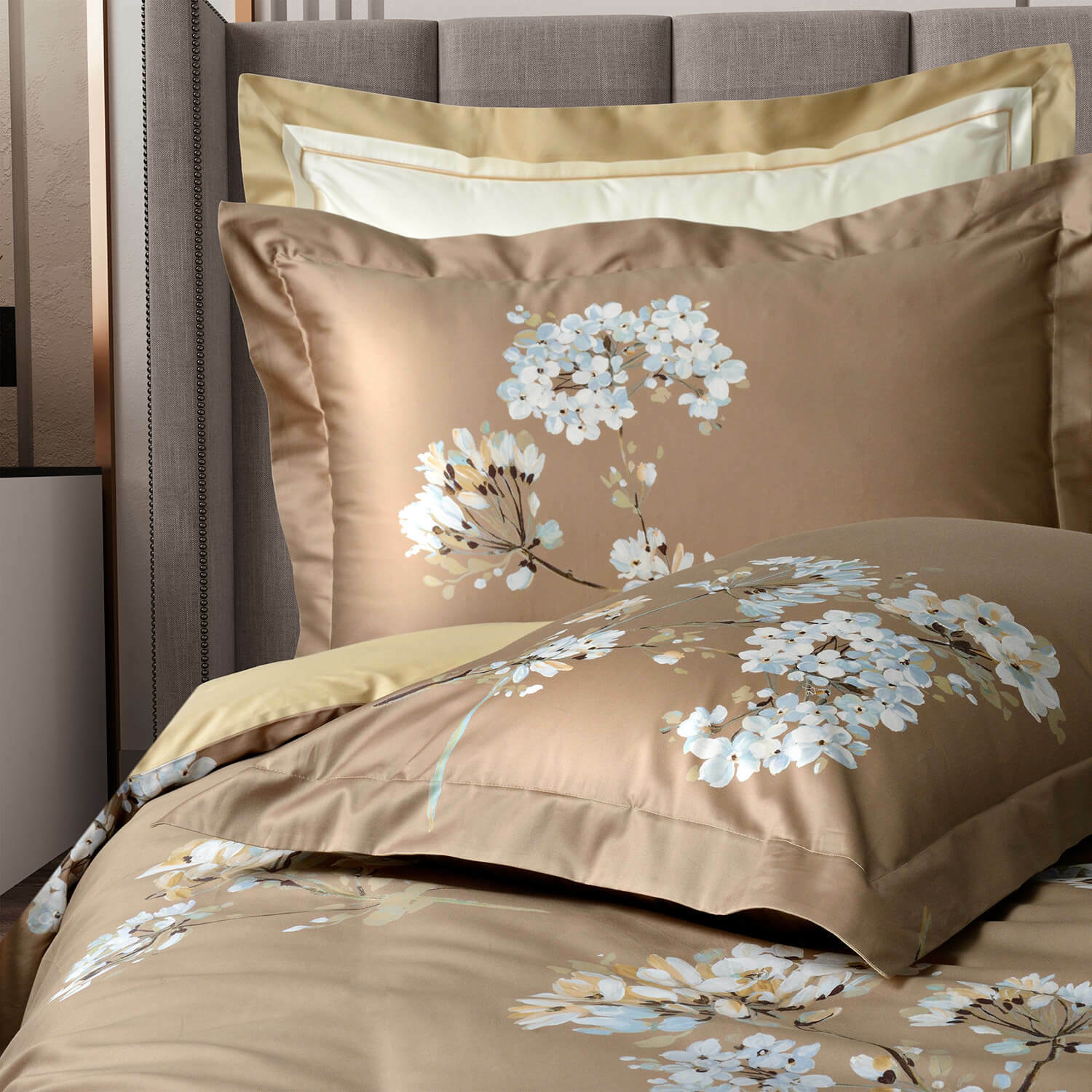 Внешняя сторона пододеяльника и наволочек выполнена в золотистых оттенках с принтом из белых букетов цветов. Золотистый оттенок фона придет комплекту роскошь и благородство, а белые цветы олицетворяют нежность и чистоту.