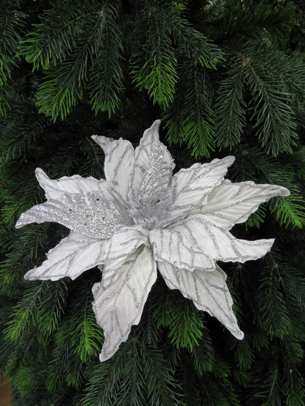 Пуансеттия на клипсе 30см House of seasons белая с серебром