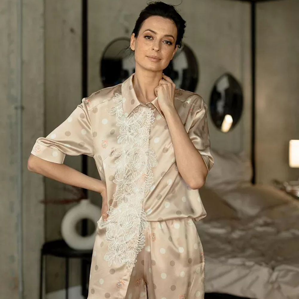 Натуральный шелк сорта Mulberry с плотностью 22 момми отличается мягкостью, прочностью и красивой драпировкой. Песочно-бежевый оттенок с узором горох делает рубашку универсальной деталью гардероба: она легко сочетается как с базовыми вещами, так и с более выразительными элементами образа.
