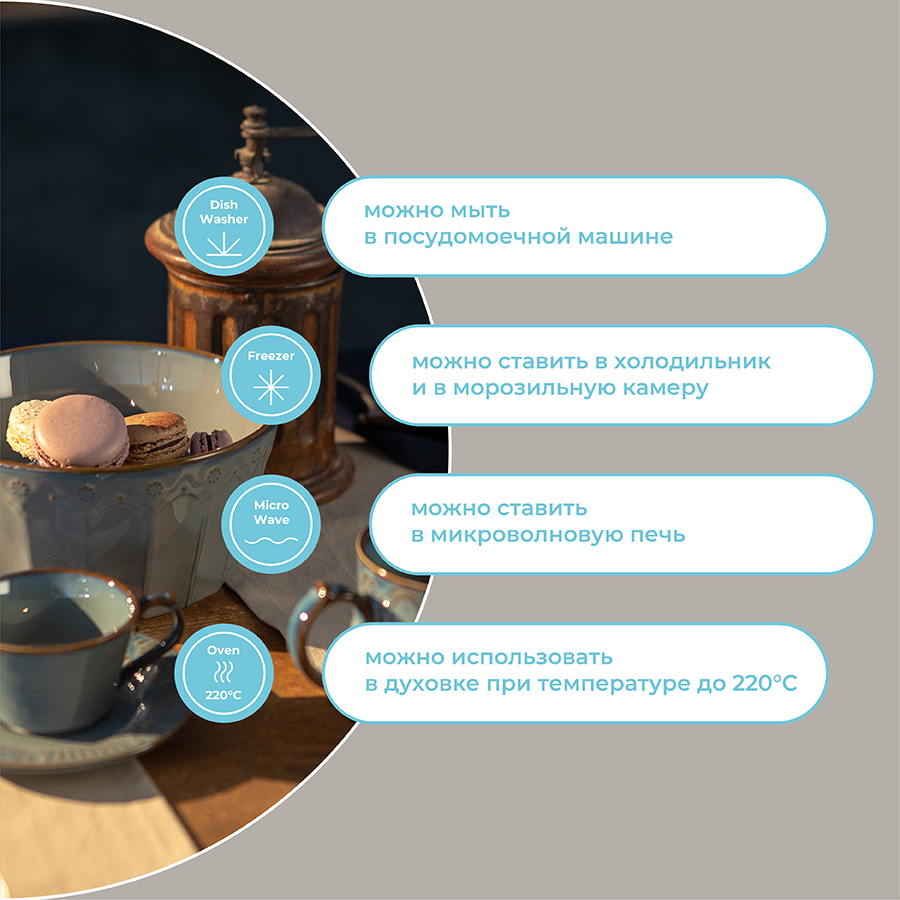 Чистое сырье высочайшего качества и собственная формула глазуровки с обжигом при температуре 1250 °C делают изделия из фарфора особо прочными, устойчивыми к растрескиванию и появлению сколов. Глазурь и декор не тускнеют со временем, сохраняя первоначальный цвет и блеск. Наши продукты прошли испытания на отсутствие в составе свинца и кадмия в соответствии со стандартными тестами FDA.