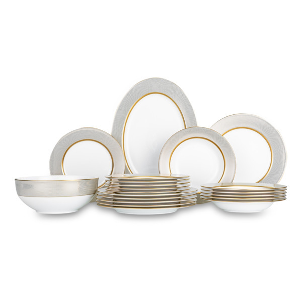 Столовый сервиз Narumi из коллекции «Золотой Алмаз» – это пример стильной роскоши, которая подчеркивает безупречный вкус владельцев. Строгий геометрический принт вступает в контраст с золотым ободком, выделяющим основание тарелок.