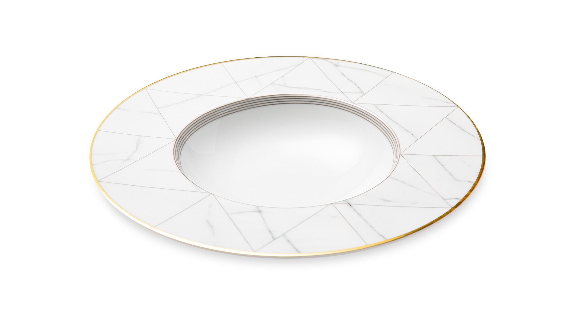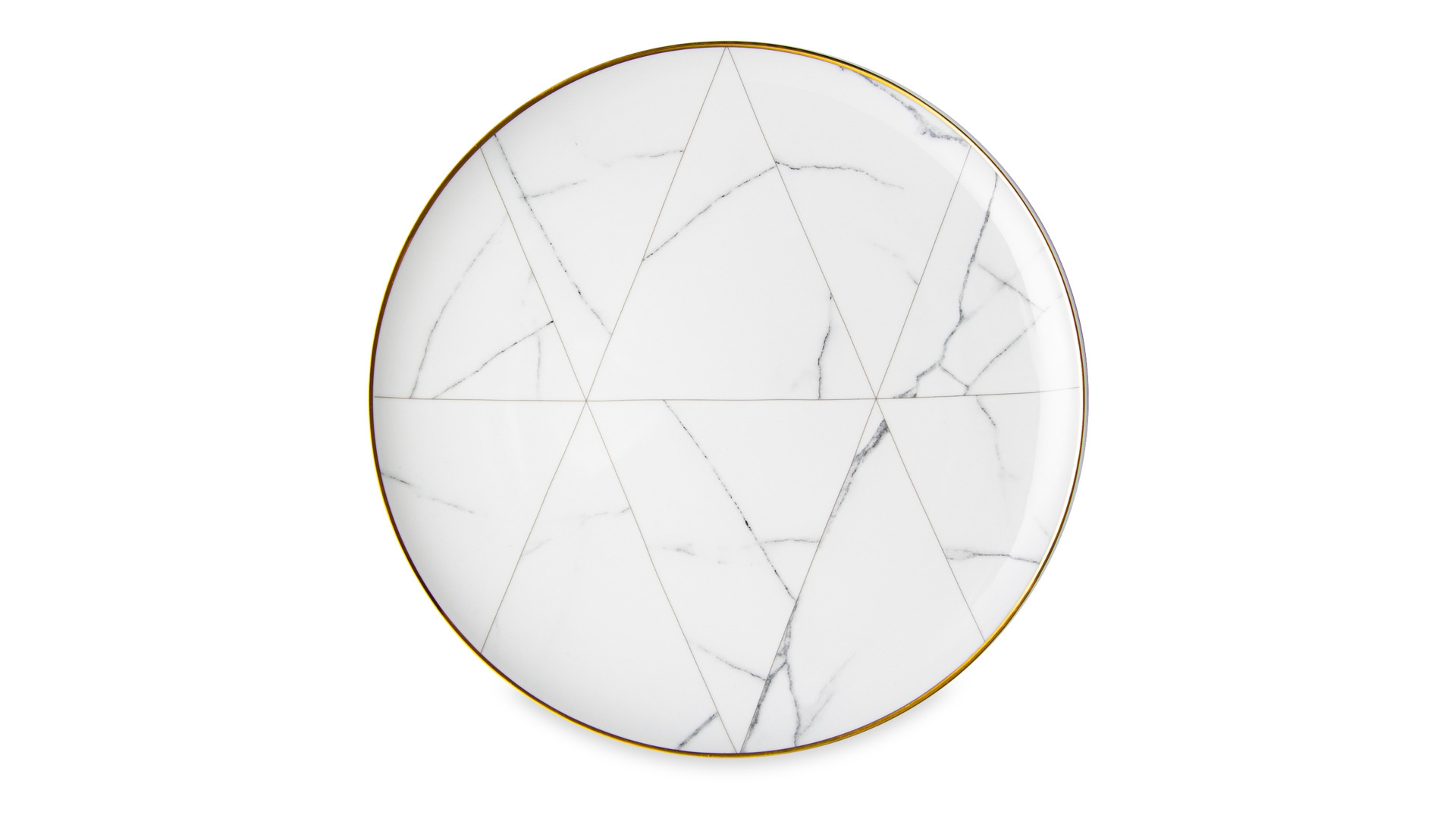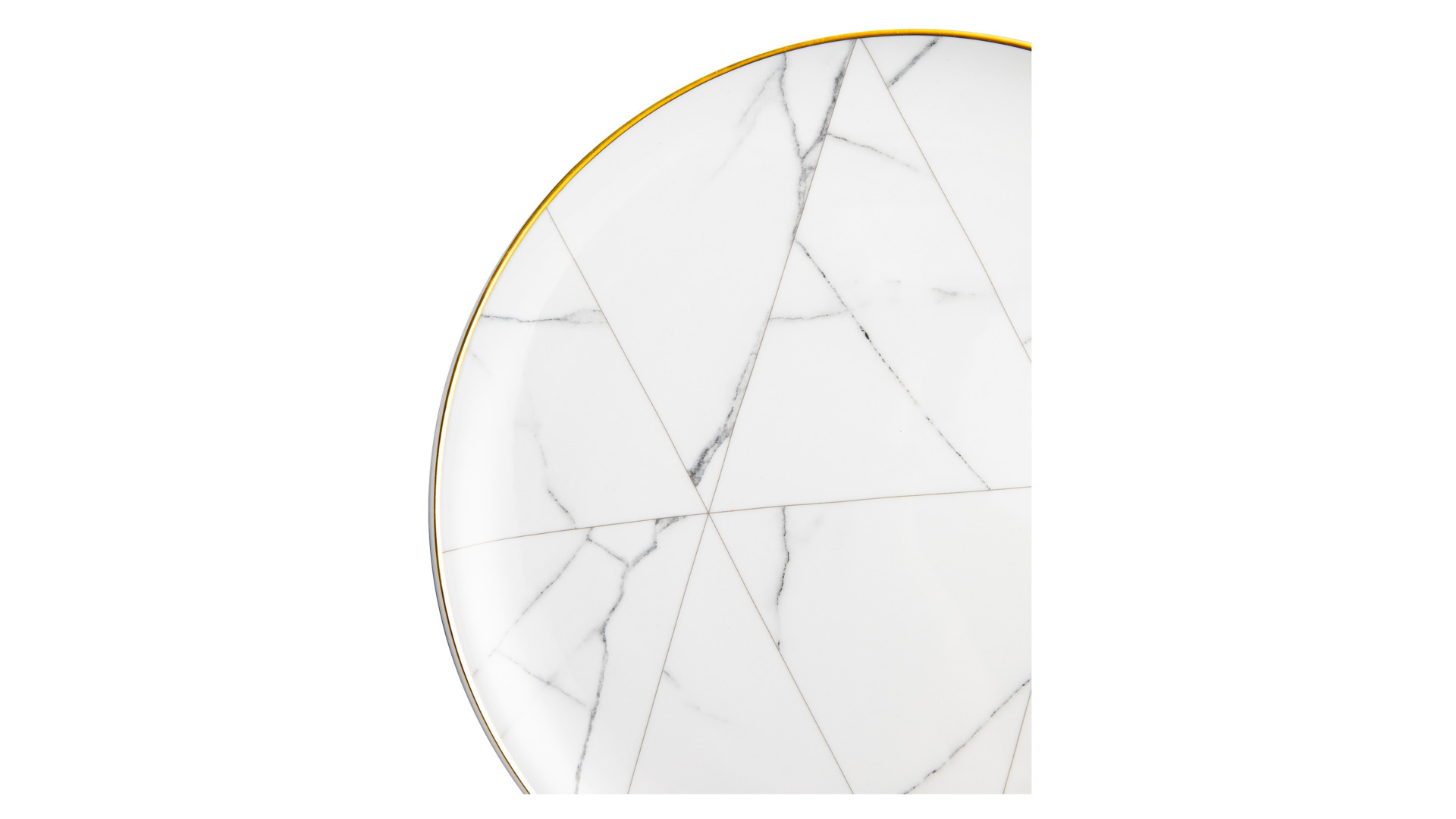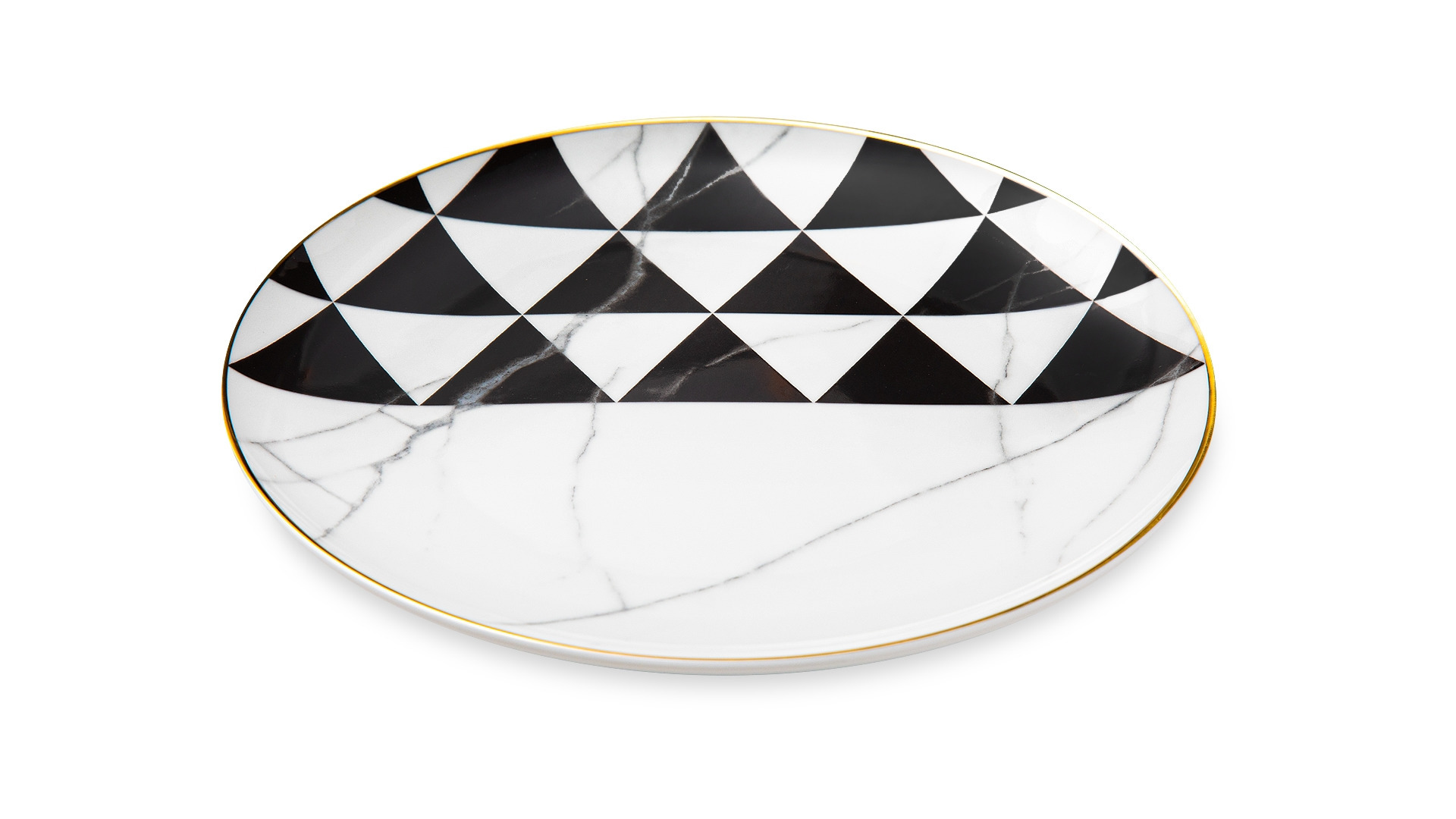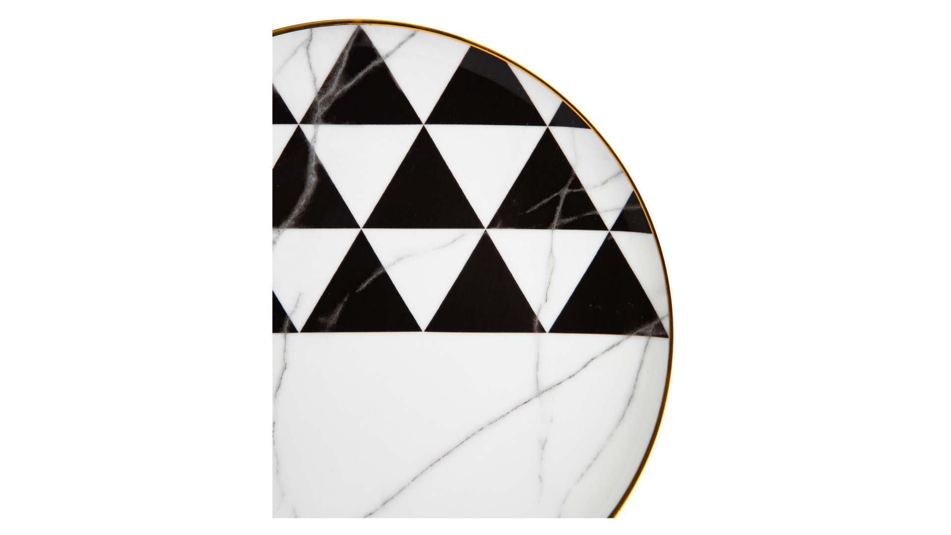 Контрастный дизайн сочетает геометричный орнамент с плавными узорами каррарского мрамора. У каждого предмета – свой особый рисунок. Посуда изготовлена из практичного фарфора, который вручную декорирован золотым кантом.