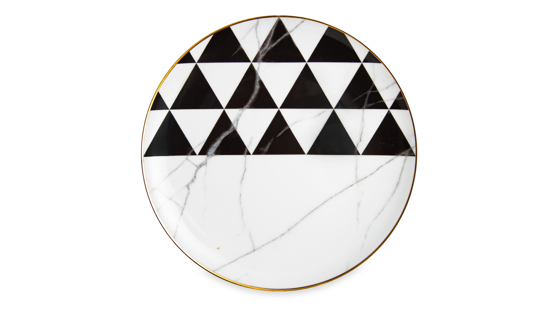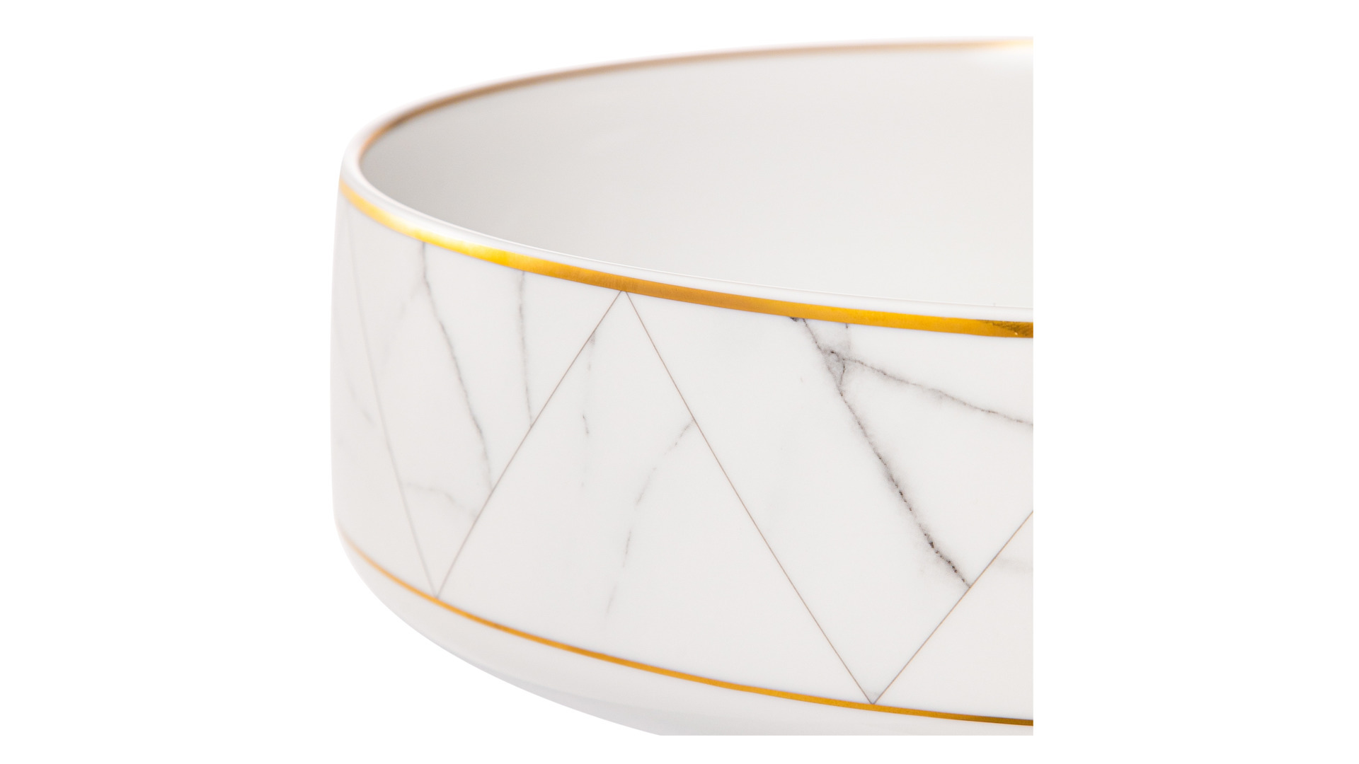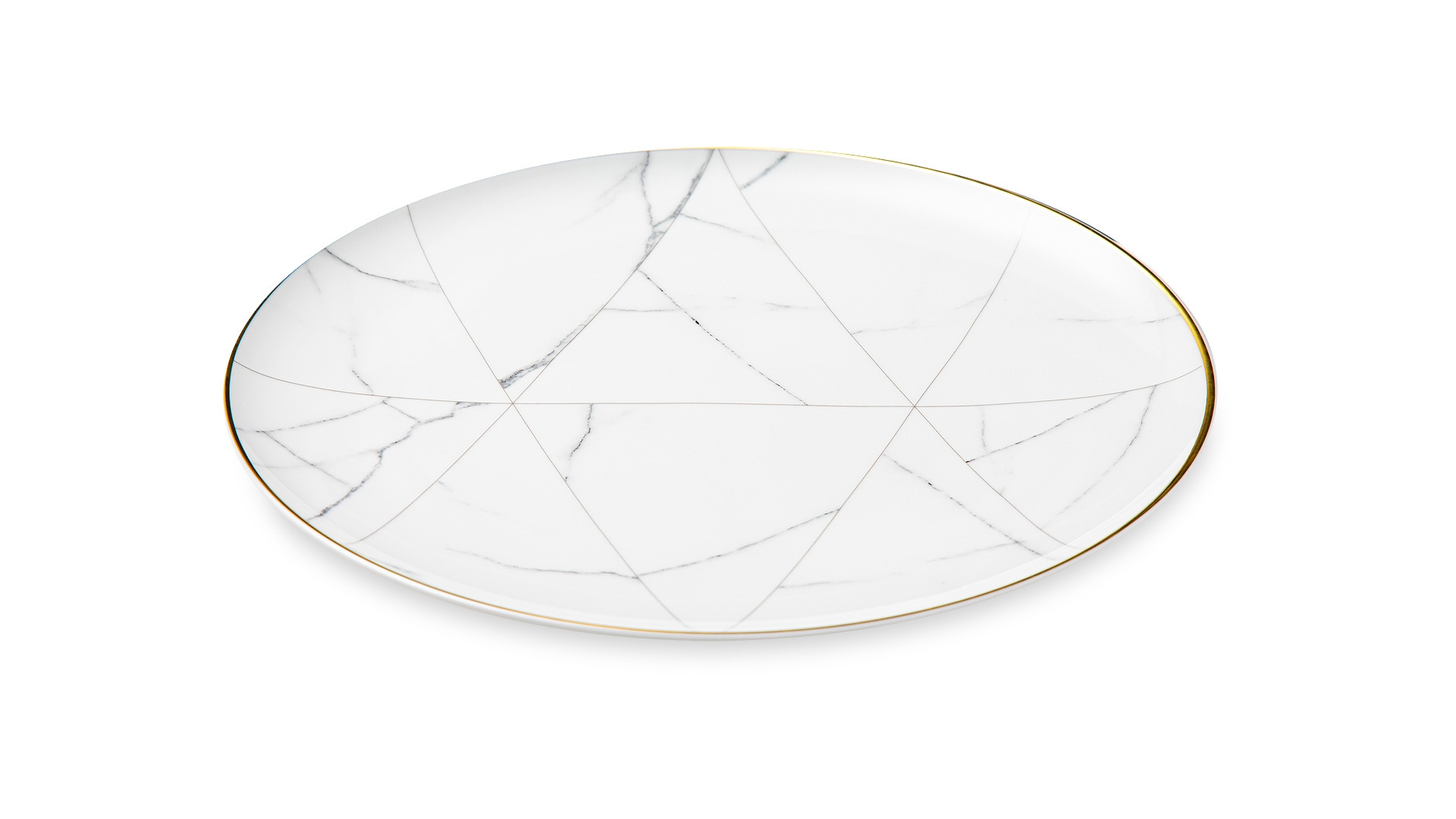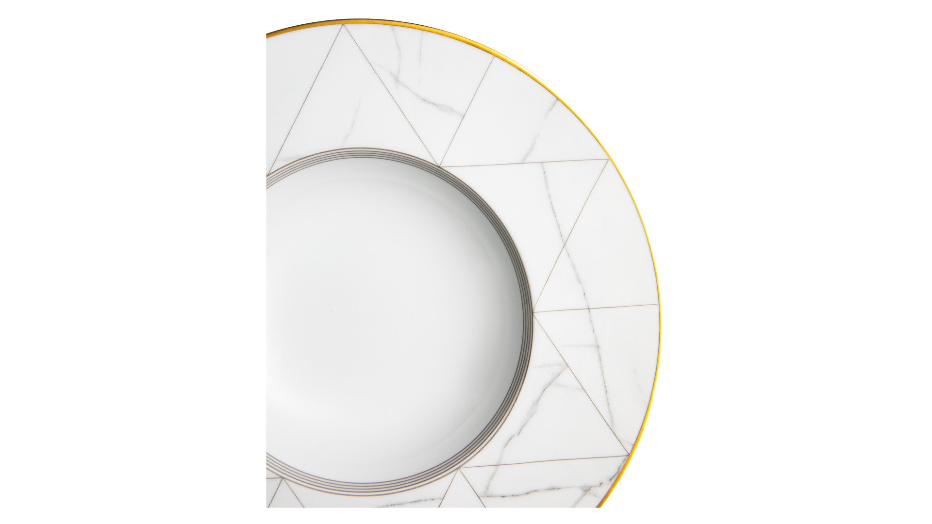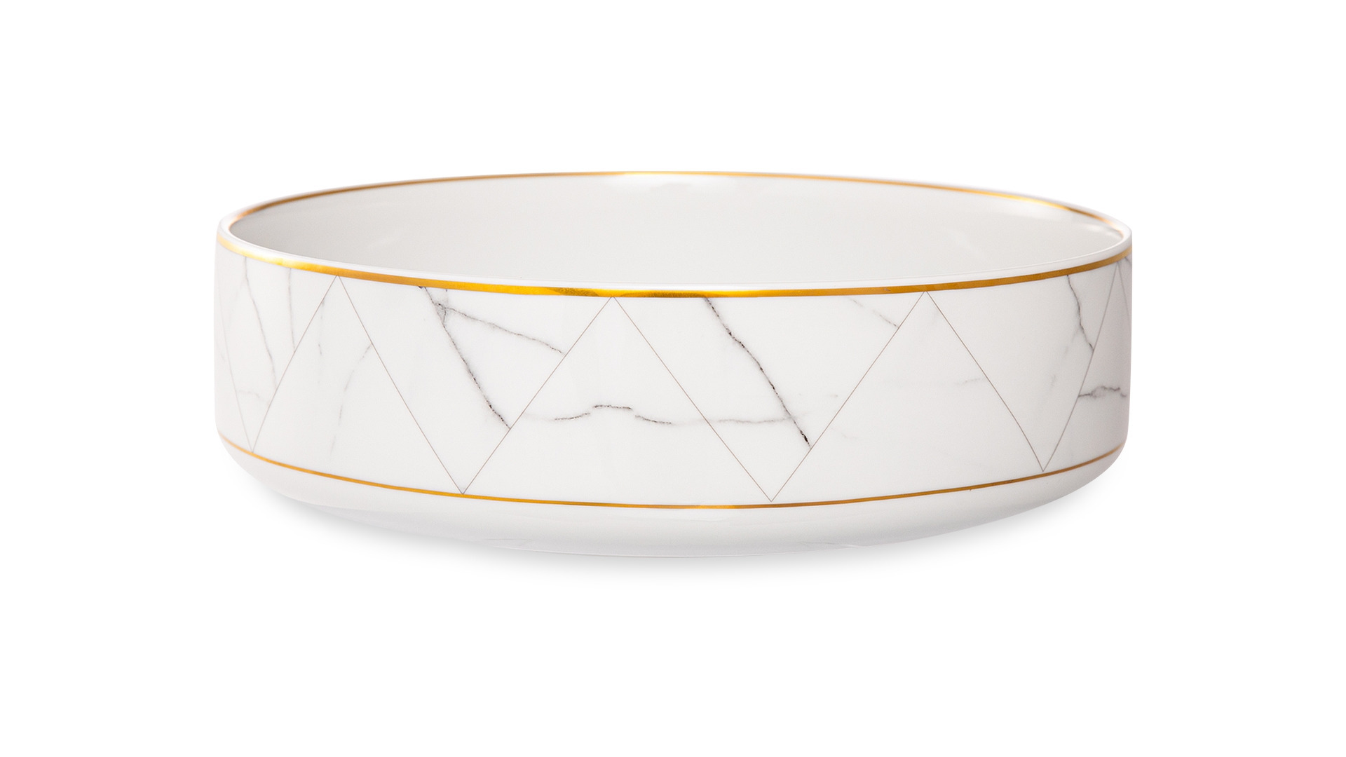 Контрастный дизайн сочетает геометричный орнамент с плавными узорами каррарского мрамора. У каждого предмета – свой особый рисунок. Посуда изготовлена из практичного фарфора, который вручную декорирован золотым кантом.