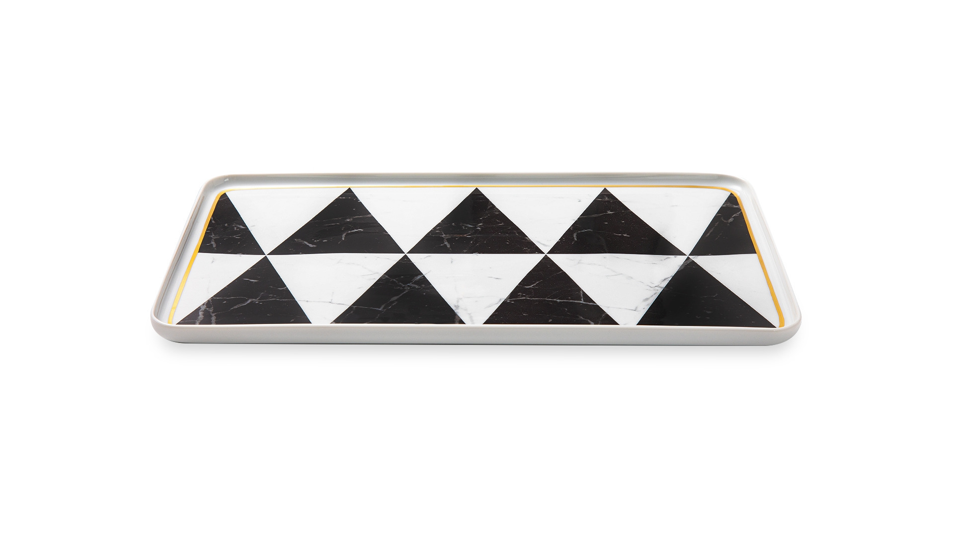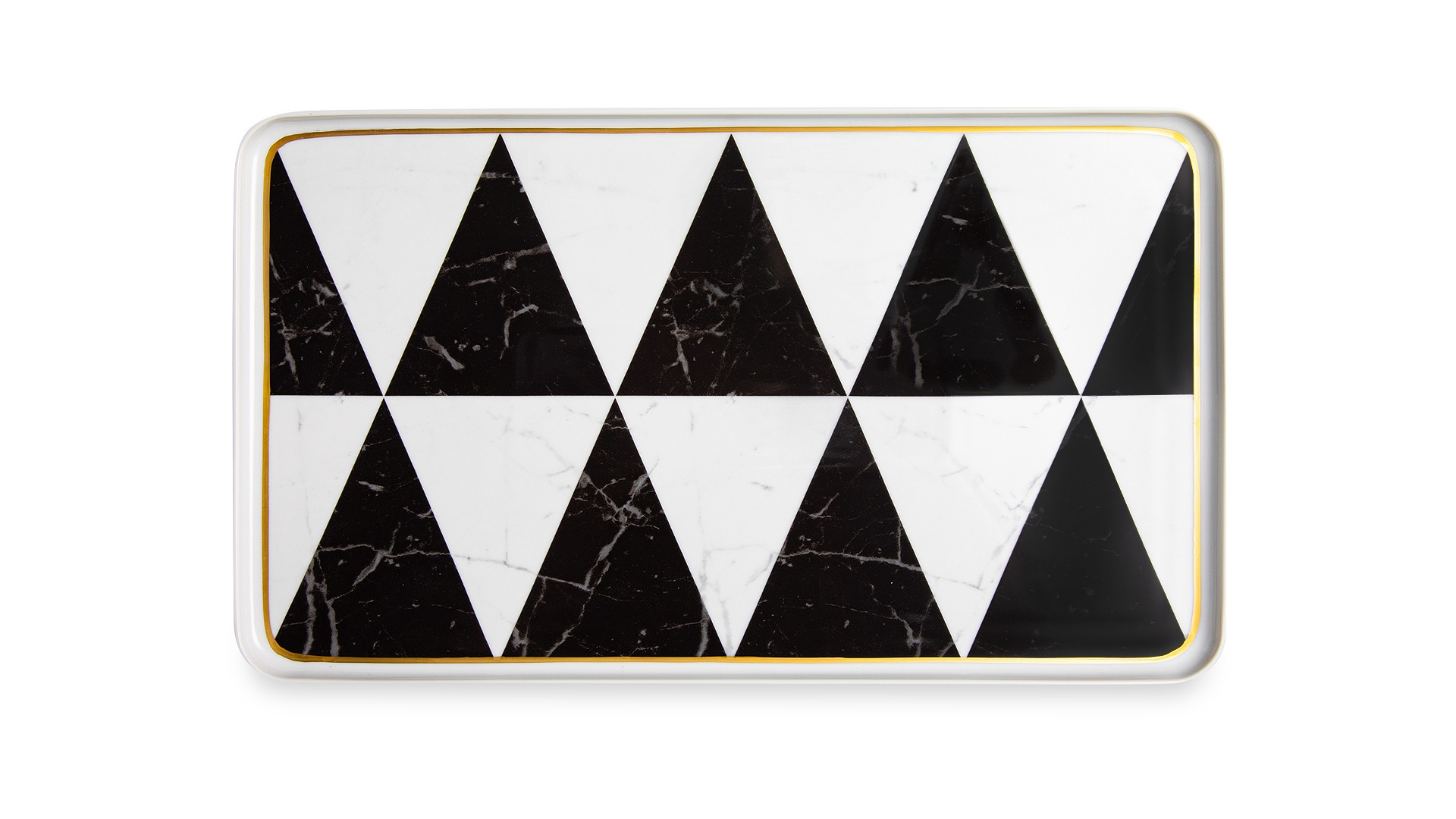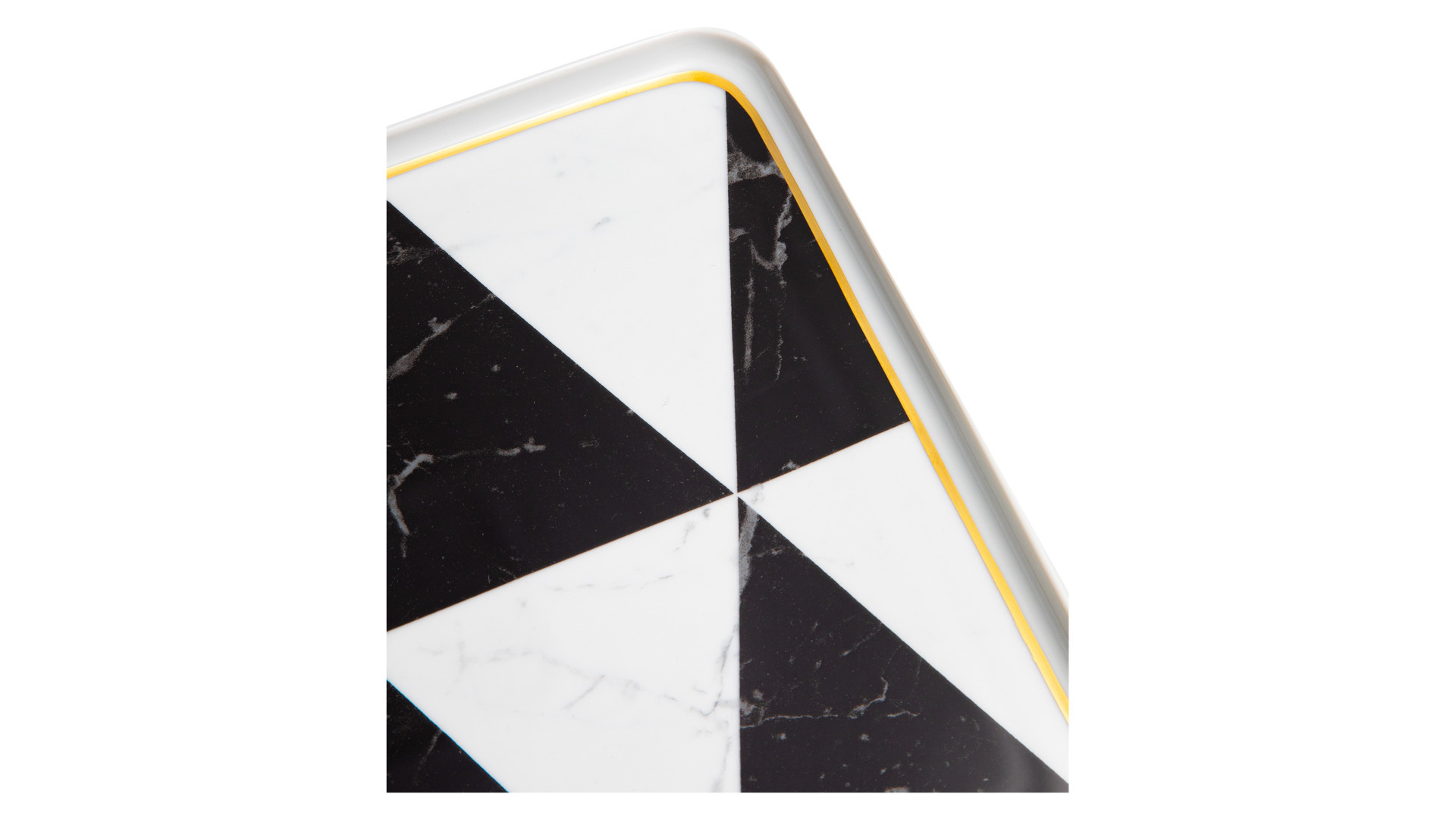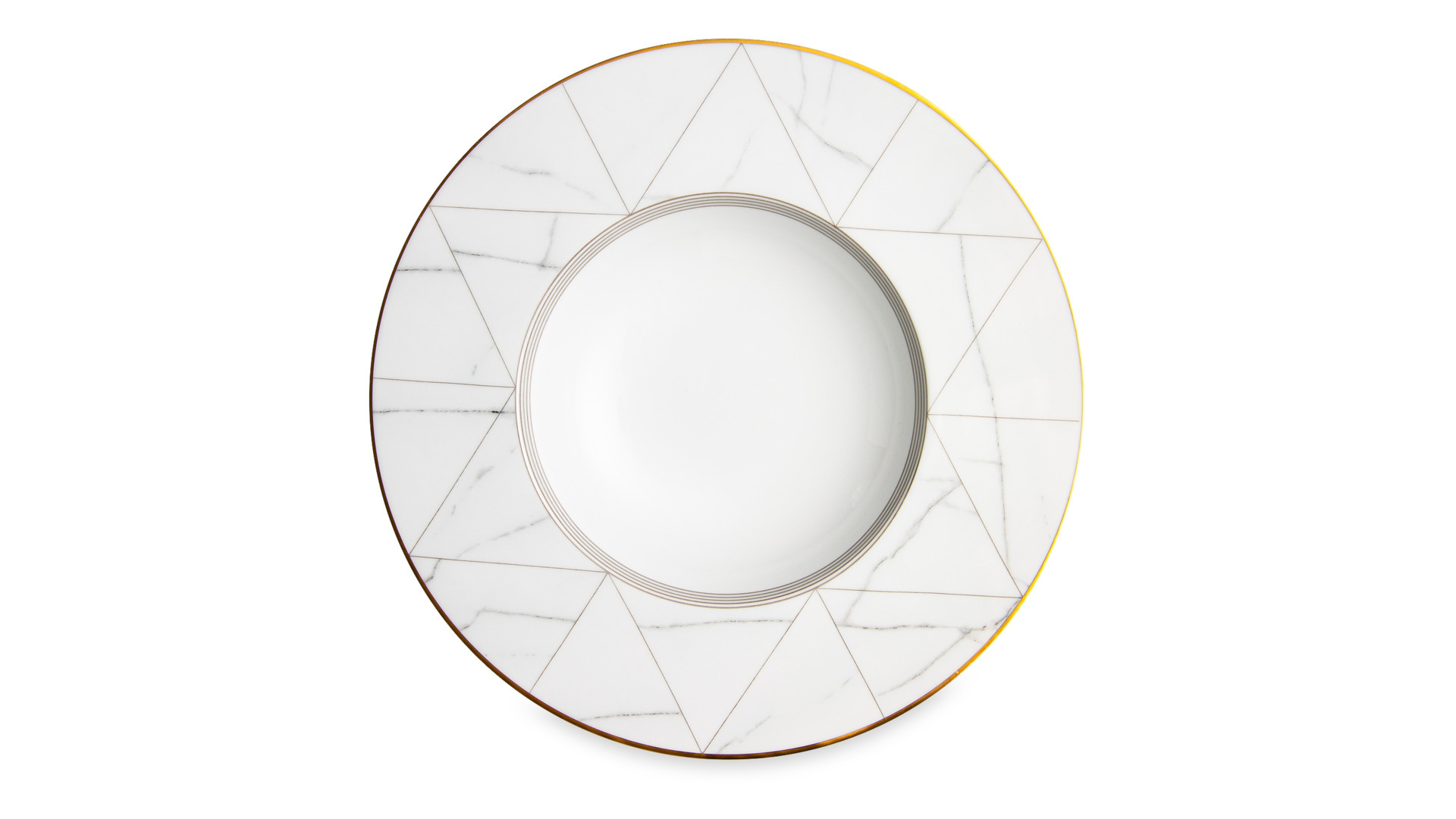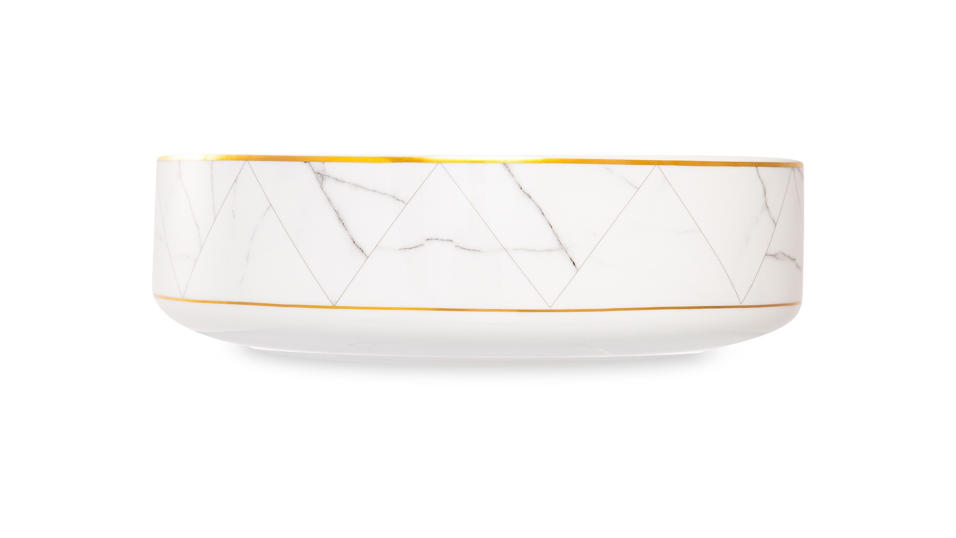 Контрастный дизайн сочетает геометричный орнамент с плавными узорами каррарского мрамора. У каждого предмета – свой особый рисунок. Посуда изготовлена из практичного фарфора, который вручную декорирован золотым кантом.