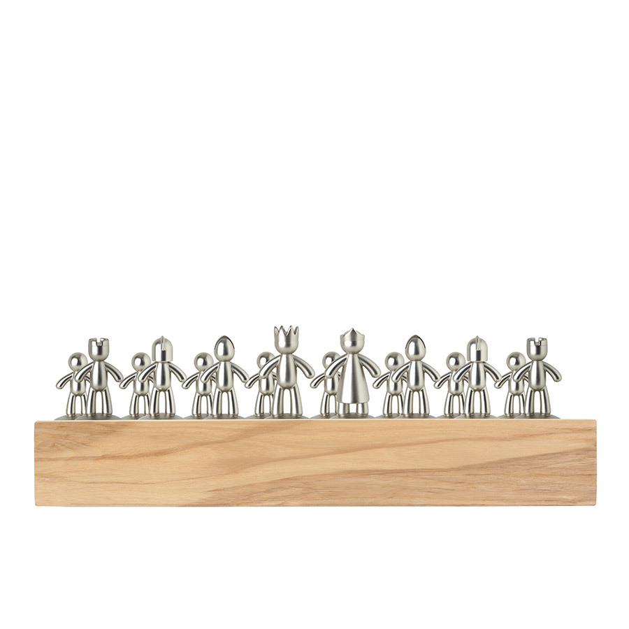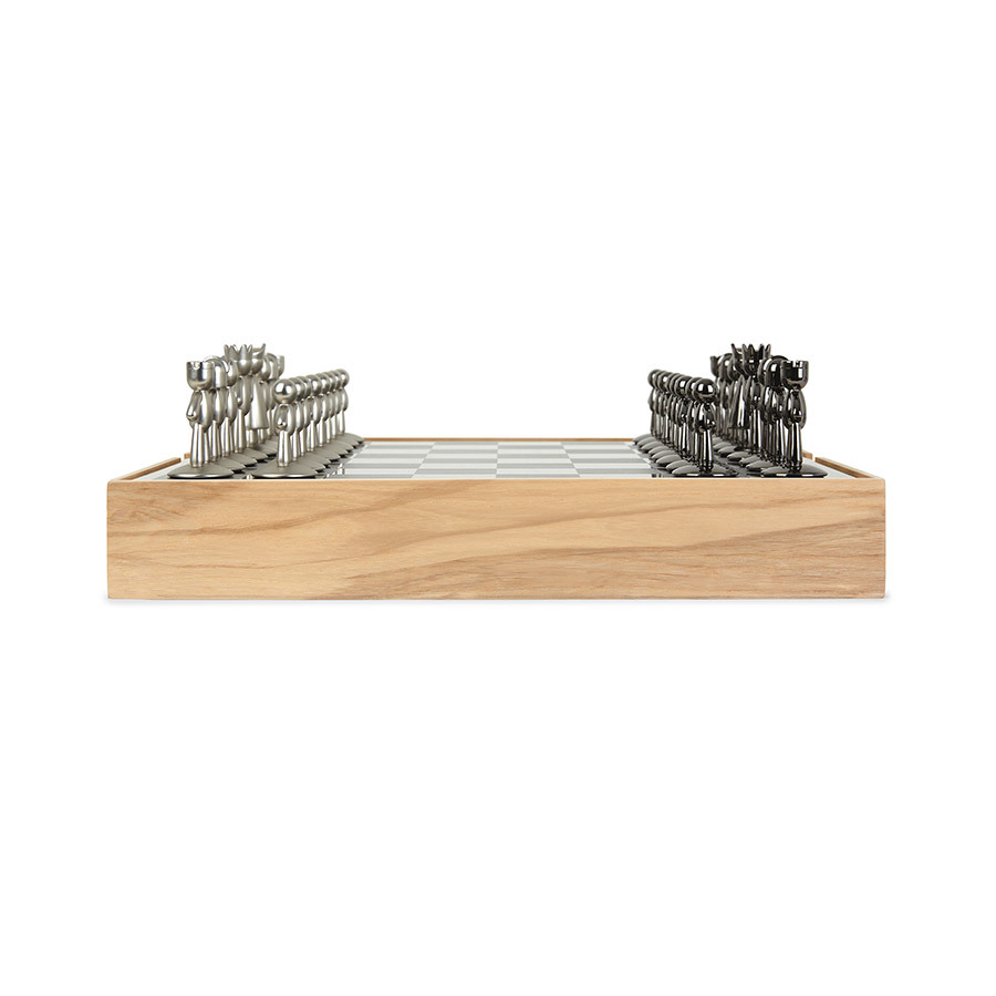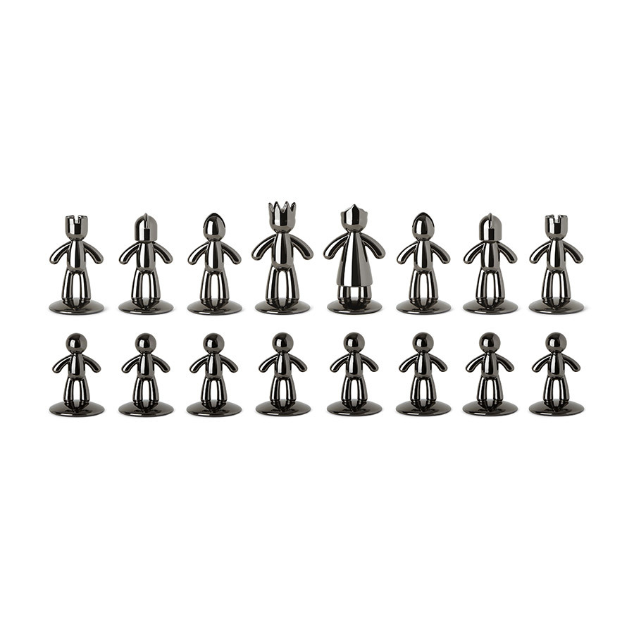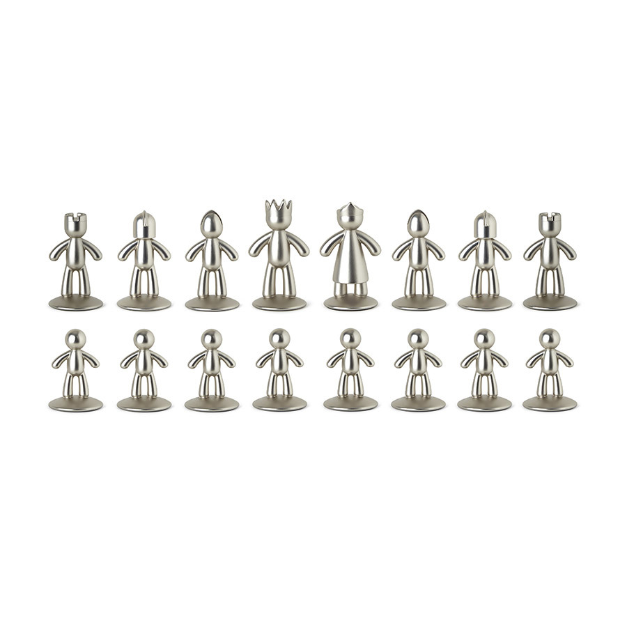 Набор из шахматной доски и необычных шахмат в виде культовых человечков Buddy. Шахматные фигуры выполенены из металла с никелевым и титановым покрытиями и бархатными накладками на основании, которые защищают поле от царпапин. Металлическое шахматное поле заключено в деревянную коробку из натурального ясеня, которая также служит местом для хранения шахматных фигур. Шахматы Buddy станут отличным подарком и для заядлых шахматистов, и для тех, кто просто любит красивые необычные вещи.