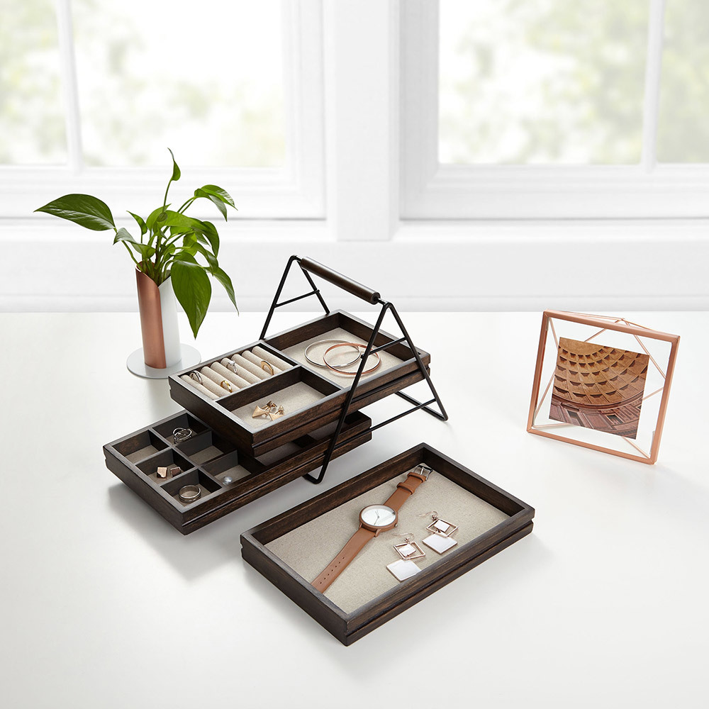 Деревянная многоярусная шкатулка для украшений. Три отделения раздвигаются друг относительно друга, благодаря чему всё содержимое шкатулки будет перед глазами. Внутренняя часть отделана льном. В шкатулке есть подушечки для хранения колец или запонок, маленькие секции для серёжек и брошей и большое отделение для браслетов, цепочек и ожерелий. , ,Дизайнер Sung Wook Park