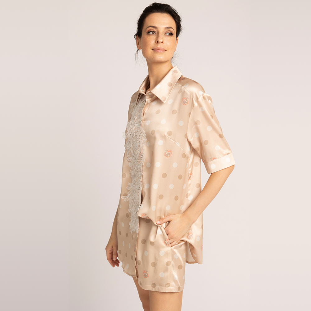 Натуральный шелк сорта Mulberry с плотностью 22 момми ценится за мягкость, прочность и красивую драпировку. Песочно-бежевый оттенок с узором горох делает шорты стильной деталью гардероба, которую легко сочетать с базовыми и акцентными вещами.