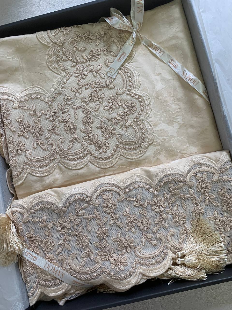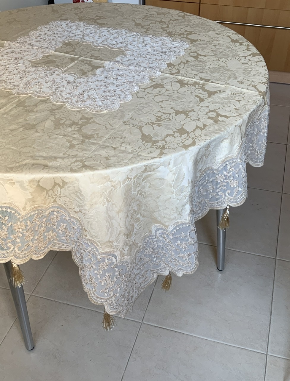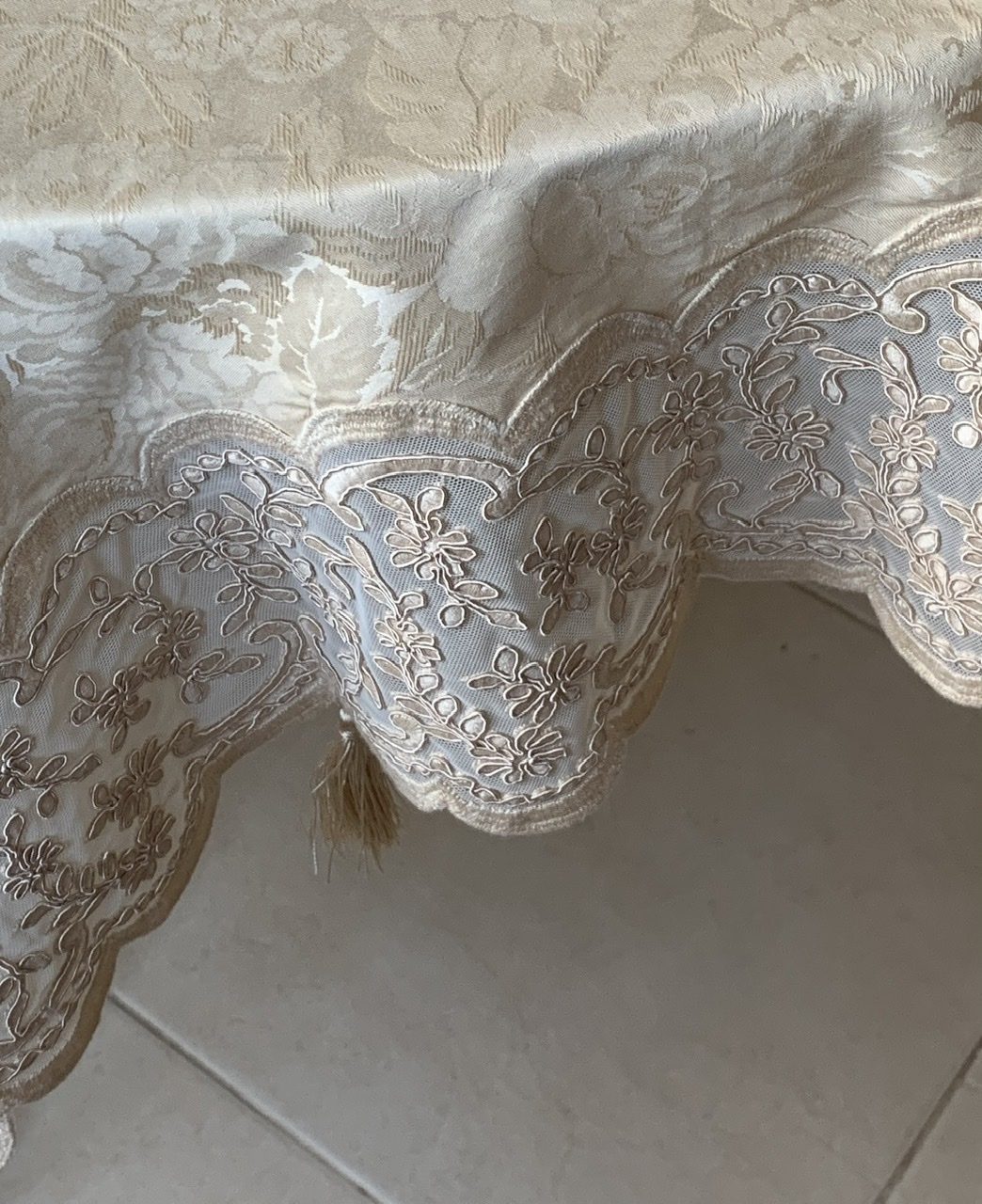Скатерть с эффектной вышивкой и изящным кружевным декором. Добавит нотку очарования и элегантности в общее оформление стола.