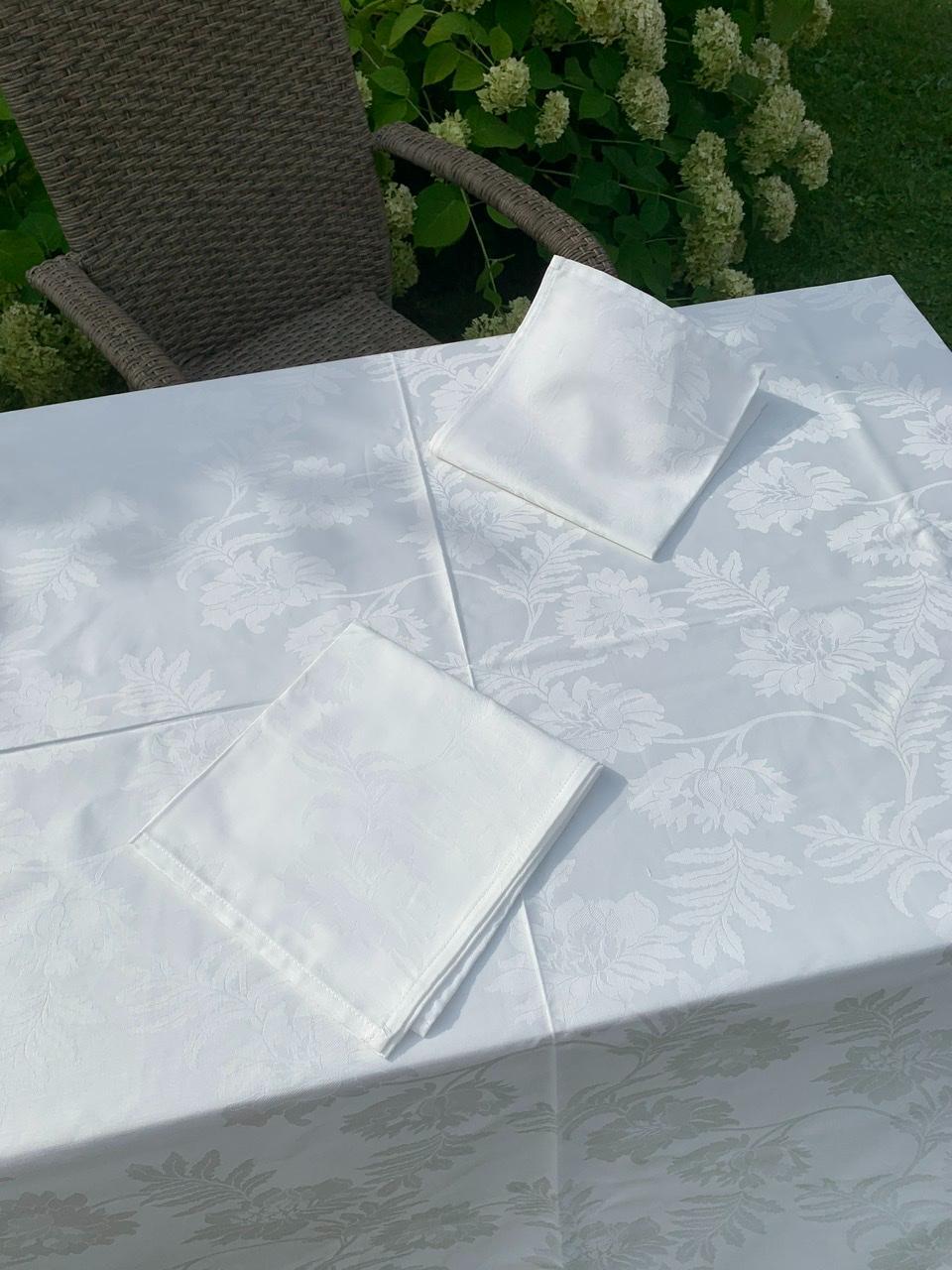 Эта скатерть с салфетками - достойная, красивая. Долго прослужит, будет радовать глаз и не выйдет из моды. Она легко вписывается в разные стили интерьеров (универсальные цвета: белый, сливочный и темно- бежевый).