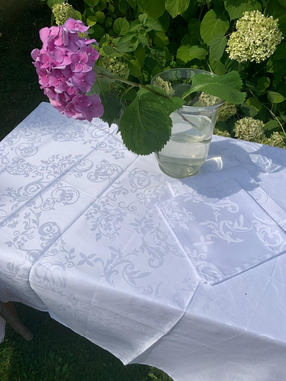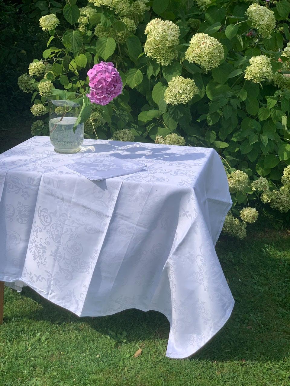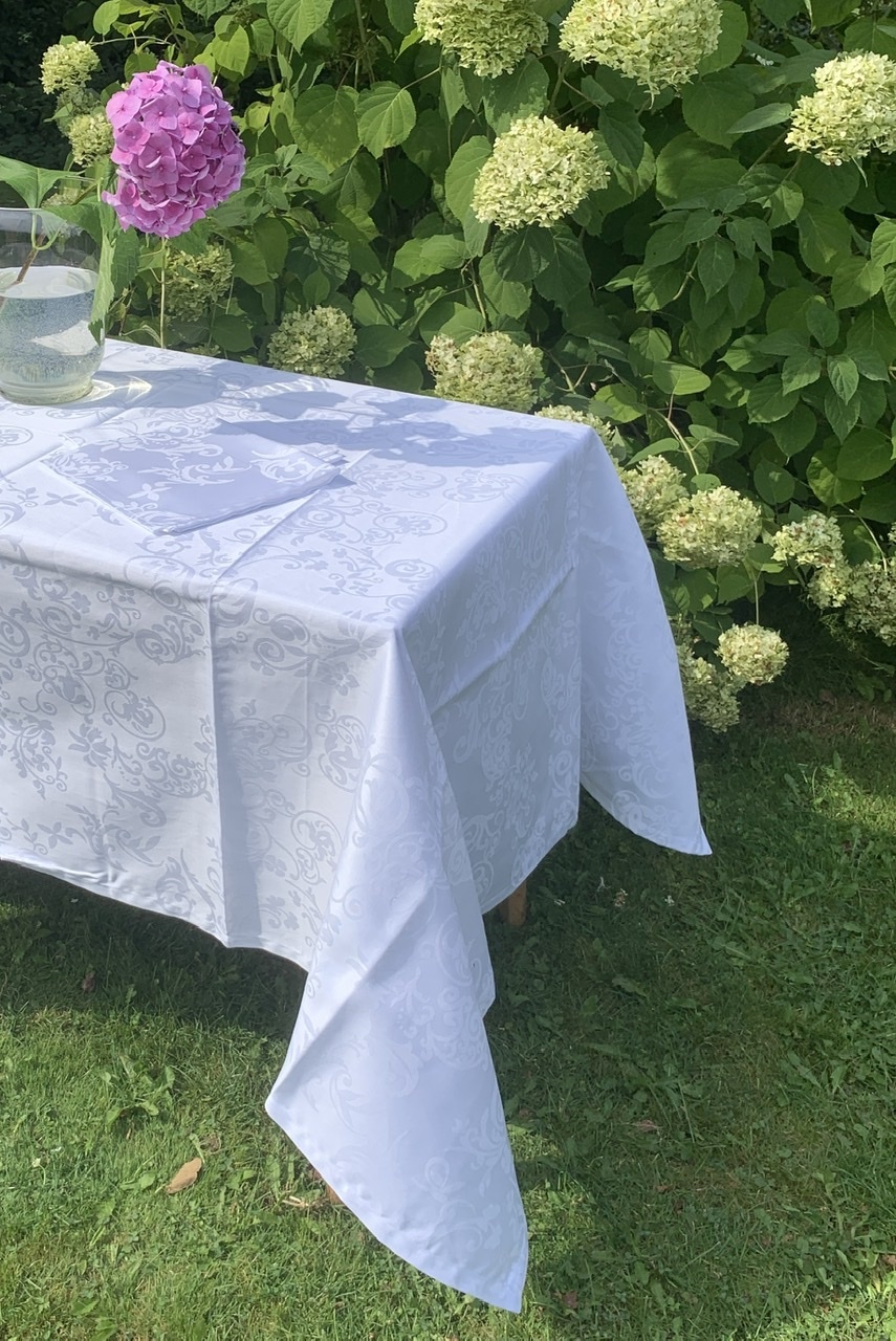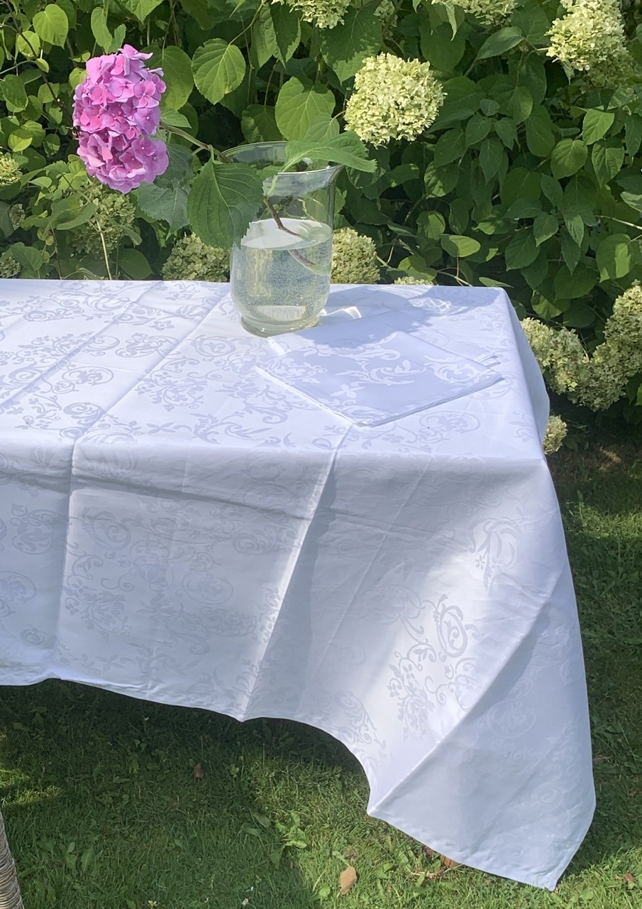 Белоснежная жаккардовая скатерть всегда выглядит роскошно, но несмотря на это она прекрасно подходит и для повседневного использования. К сатину (100% хлопок) очень приятно прикасаться.