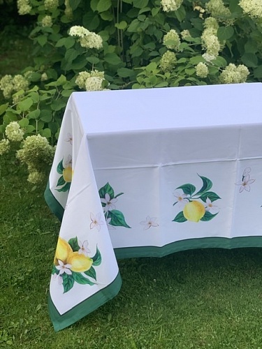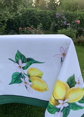 Красивая высококачественная итальянская скатерть в классическом стиле. Выполнена из белого плотного хлопка, украшена сочными живописными лимонами.
